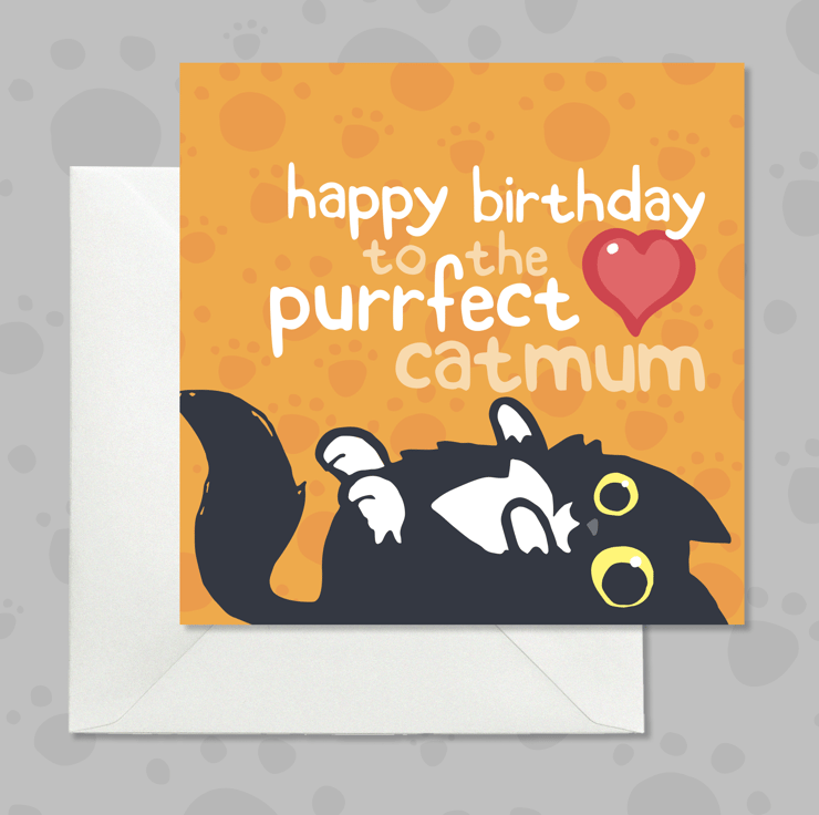 Celebrate the purrfect cat mum with this adorable and funny birthday card. The card features a playful black and white tuxedo cat lying on her back against a bold orange background, with the message “happy birthday to the purrfect catmum” in modern white text. This bright and cheerful card is ideal for cat mums who love humour, and their furry companions. Printed on premium semi-gloss 350gsm card, blank inside, and includes an ivory white envelope.