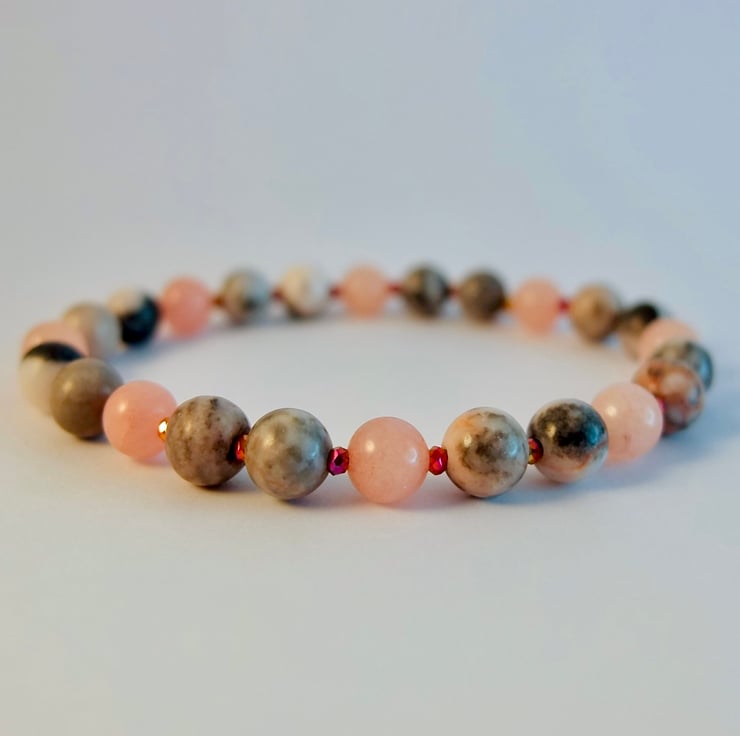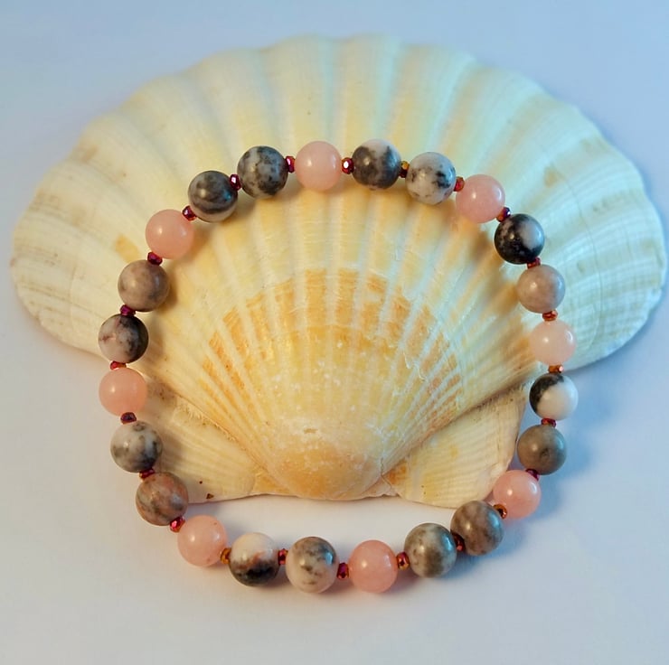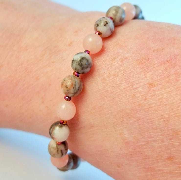 Chunky stretch bracelet featuring 6mm Pink Zebra Jasper and 6mm Pink Opal beads.