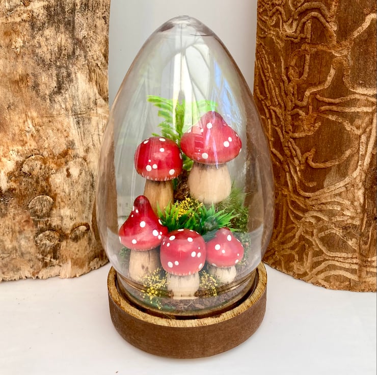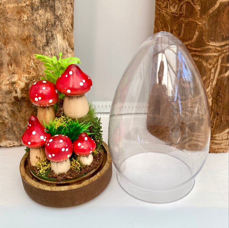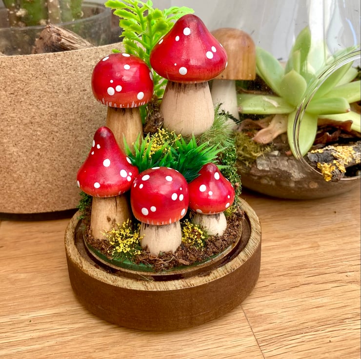 A group of red toadstools arranged amongst moss and plastic flowers.