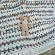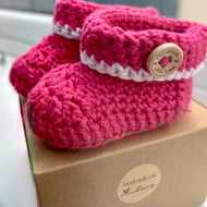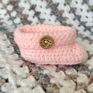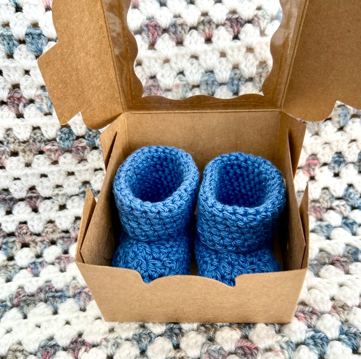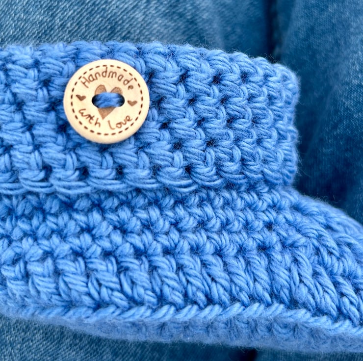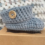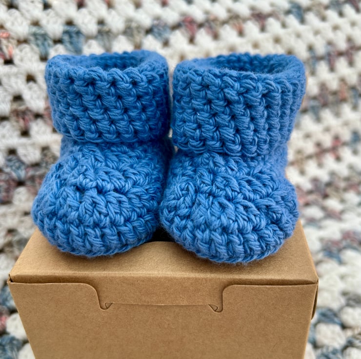 A dear little pair of babies blue booties crocheted in a lovely soft, machine washable 100% cotton yarn.