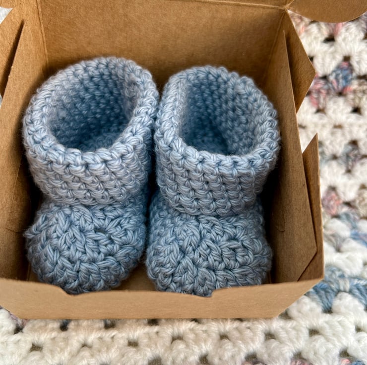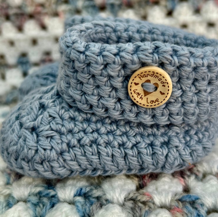 A dear little pair of babies grey booties crocheted in a lovely soft, machine washable 100% cotton yarn.