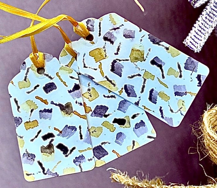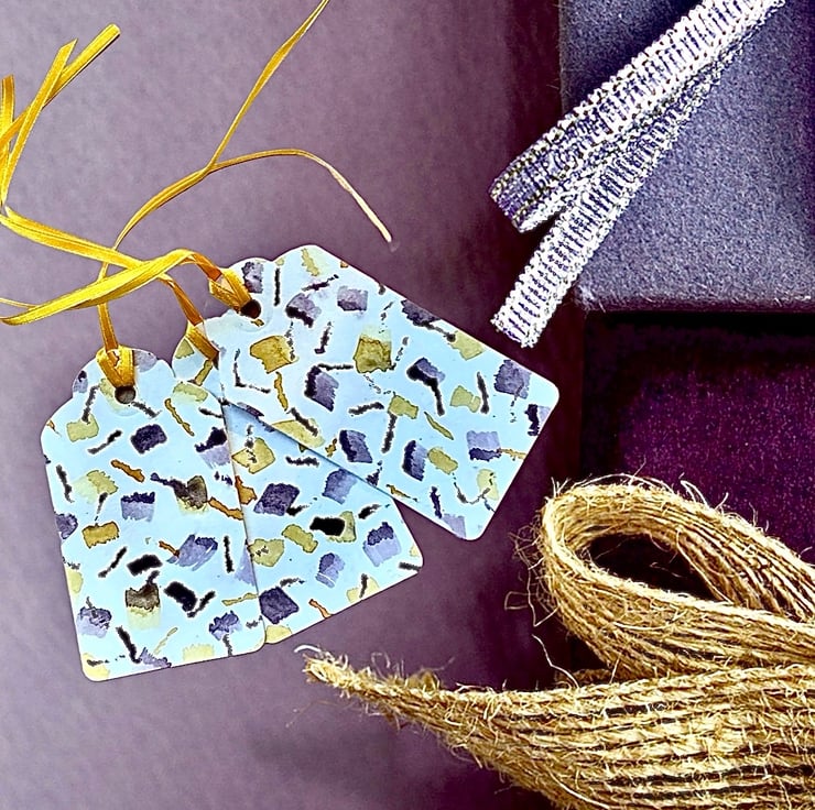 Playful hand painted watercolour gift tags in pretty shades of violet and golden yellow with yellow satin ribbon. Painted on watercolour paper 300 gsm. Each tag measures 10 x 5 cm with rounded corners.