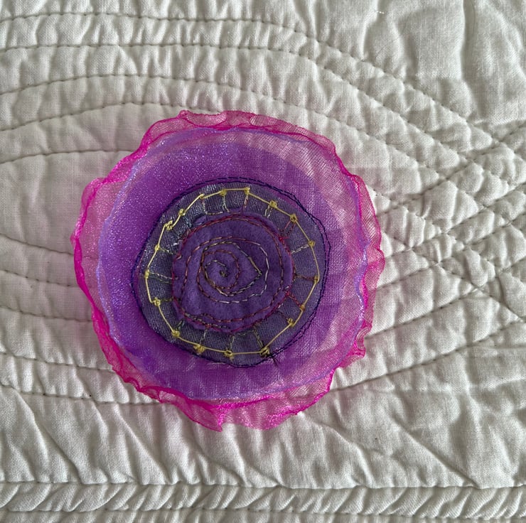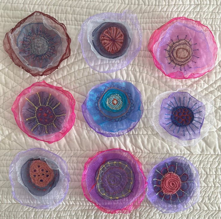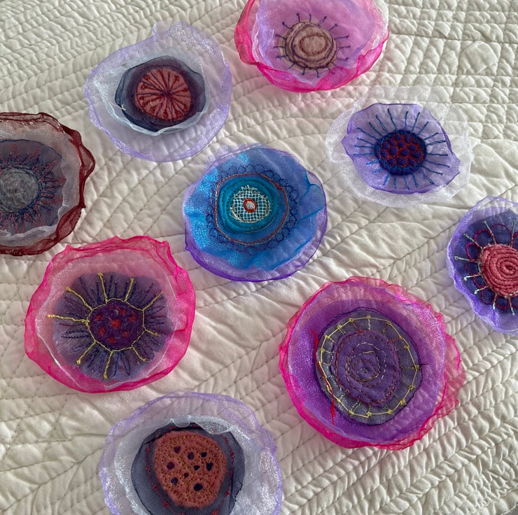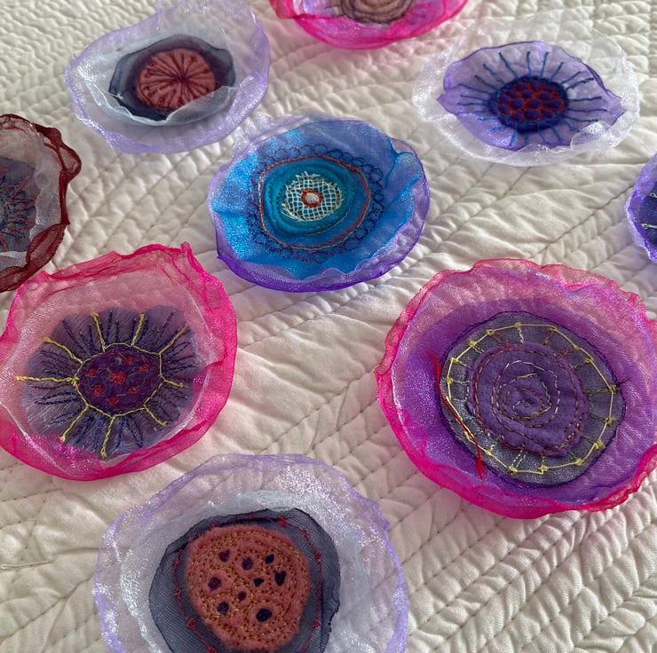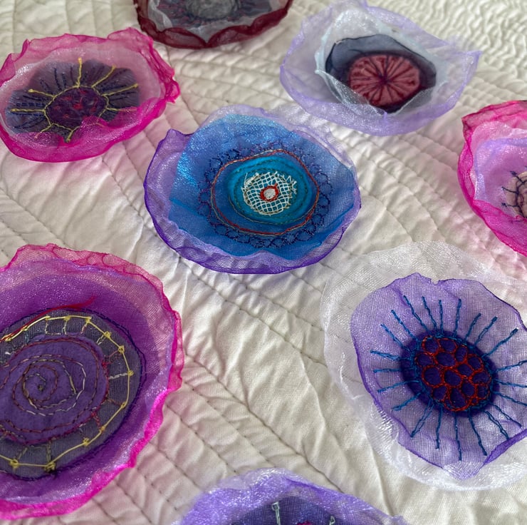 Each one is made of at least 3 layers of organza, a centre of felt and embroidery thread which has been free motion embroidered to add detail. There may be a little lace detail too.