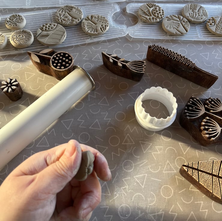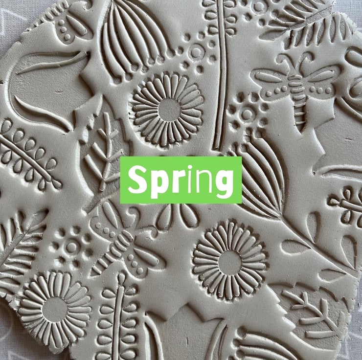 Made from white earthenware clay, this series of textured brooches are handmade from start to finish. Initially texture is applied to the surface of the clay using a series of decorative Spring wooden blocks. Each piece is then air dried for several days before being kiln fired to form bisqueware.