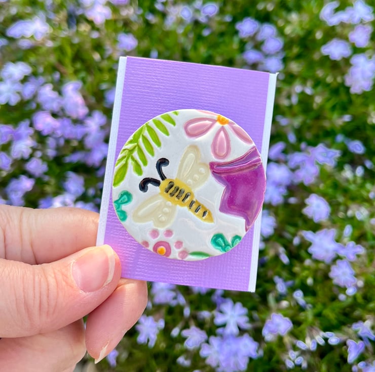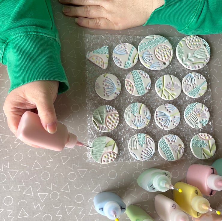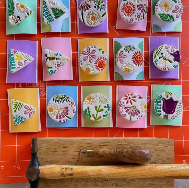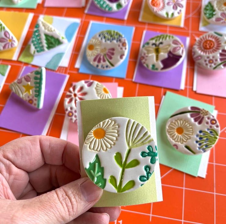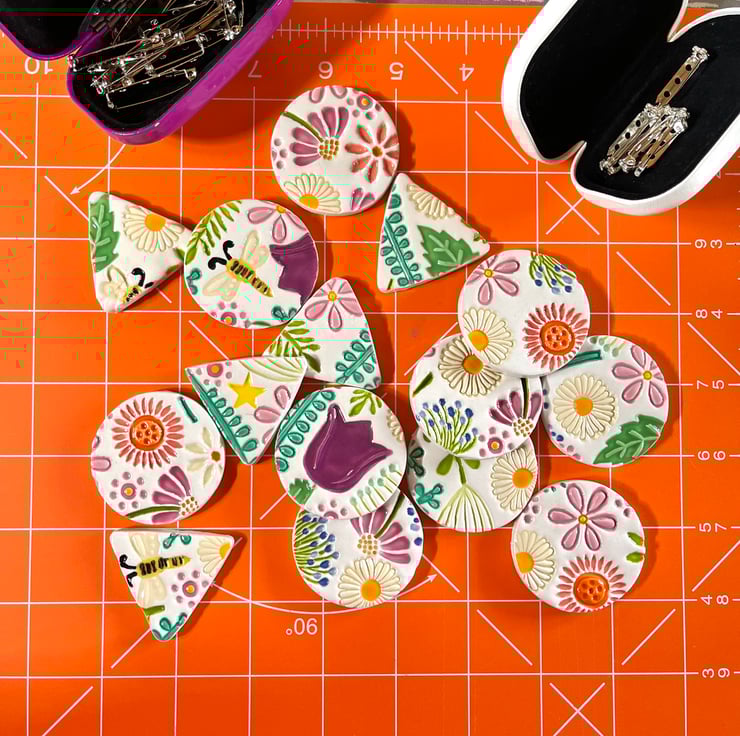Next to the fun bit, applying colour! I hand paint each brooch using a combination of Spring toned underglaze colours. Before dipping in a glossy transparent glaze and firing for the final time. A brooch pin is then attached to each piece and ta-da it’s ready to wear!
