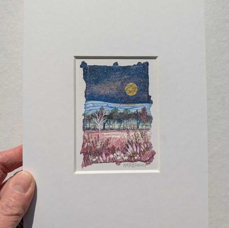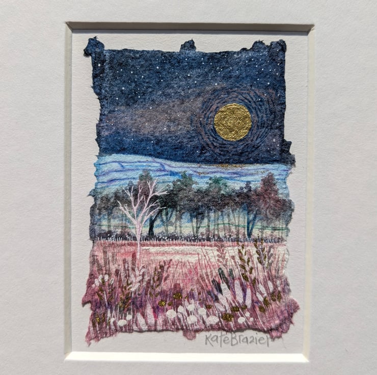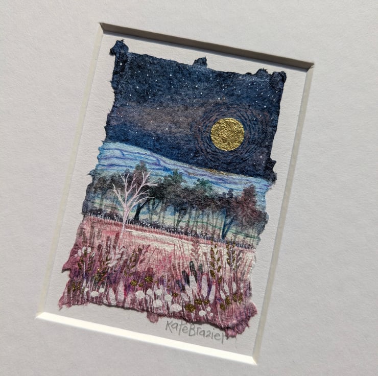 This piece is created using gouache paint on handmade Khadi paper, it has been worked into with water soluble pencils and Luminance colourfast pencils. It is then held in place with artist quality Neutral pH adhesive and float mounted in a custom mount.