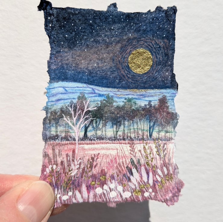 'Golden Forest Bathing' is a tiny, mixed media miniature float mounted into a custom A5 mount. It has been finished with gold pigment.
