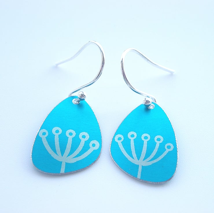 These turquoise teardrop shaped earrings are made from aluminium which I have dyed a bright turquoise and printed with a silvery white cow parsley print. The dye is made permanent through heat and becomes a part of the metal. I saw pierce the oval shape by hand and finish by doming and filing the edges. The earrings hang from sterling silver ear hooks and measure approximately 20mm x 14mm.