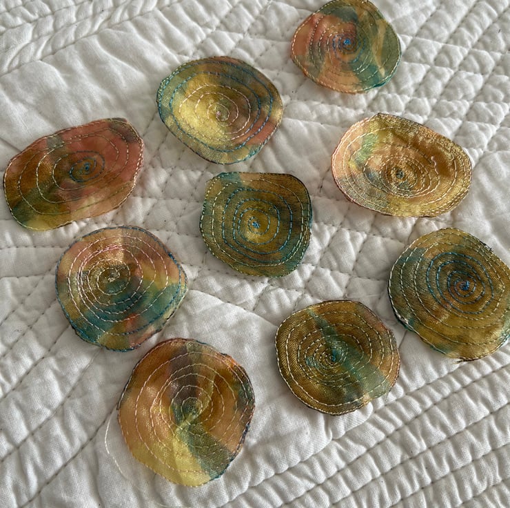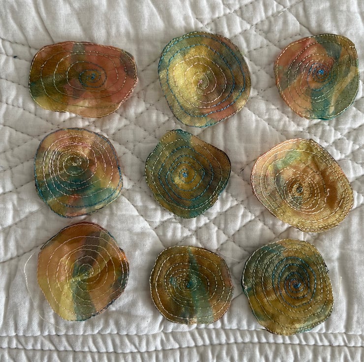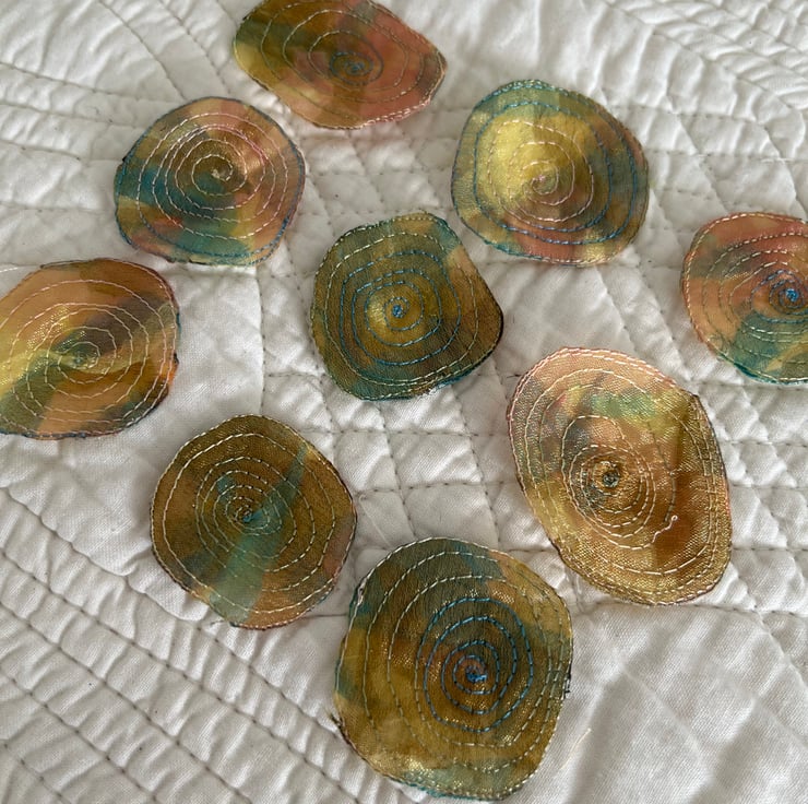 This pack of 9 spiral, circle embellishments have been made by using free motion embroidery techniques - drawing with the sewing machine. Each one is slightly different from another, giving them a quirky, individual look.