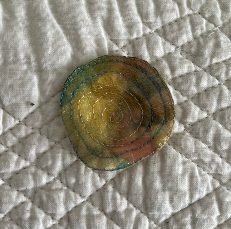 Made with organza and variegated thread, the edges are sealed using a soldering iron, sometimes giving burnished edges which adds to the quirkiness.