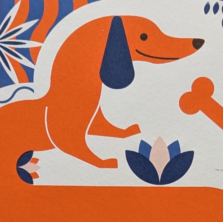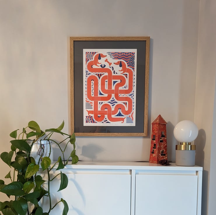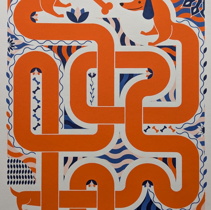 A3 Hand screen print. 4 layer print using Orange, Navy blue, Royal blue and Baby Pink.