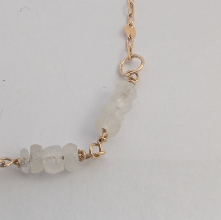 These moonstone beads are gorgeous, shimmering when they catch the light. The gold filled chain is called starburst and is made up of gold links and flat gold stars. The combination of bead and gold star is beautiful.