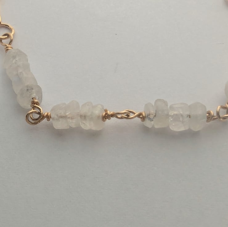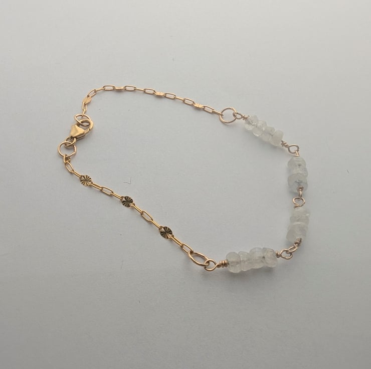 Beautiful rainbow moonstone beads strung together with gold filled wire and gold filled starburst chain. The beads measure approximately 4.5 mm and the bracelet itself