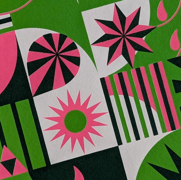 A3 Hand screen print. 3 layer print using Lime green, Fuchsia pink and Dark green.