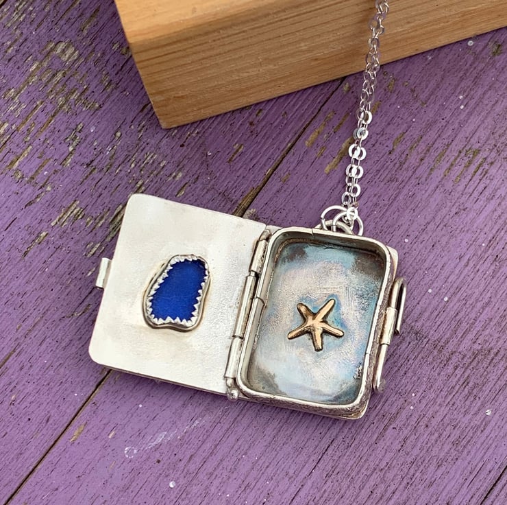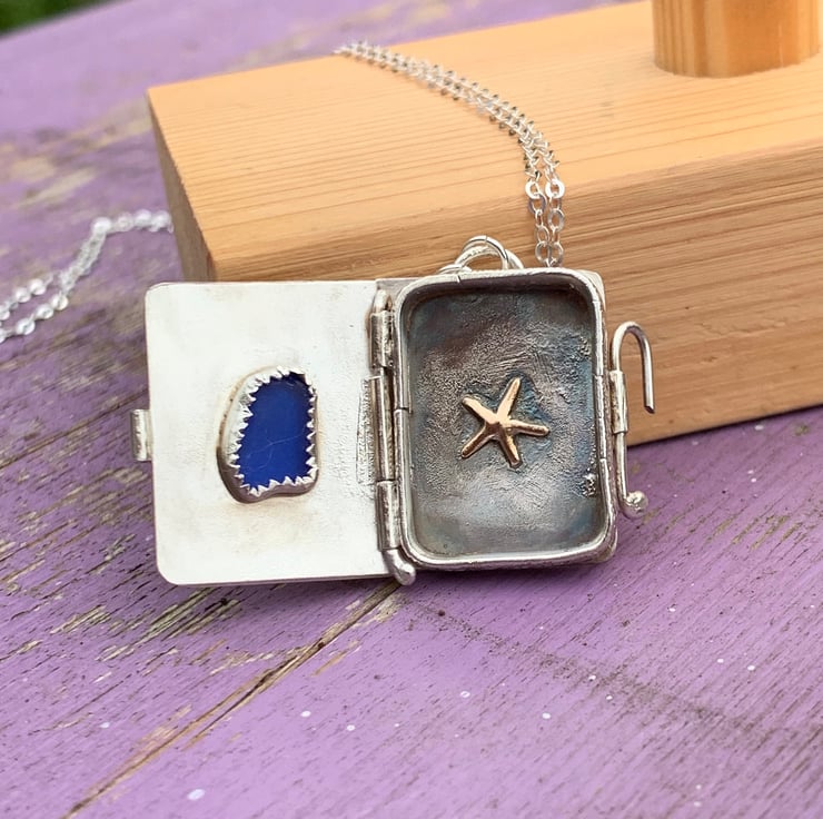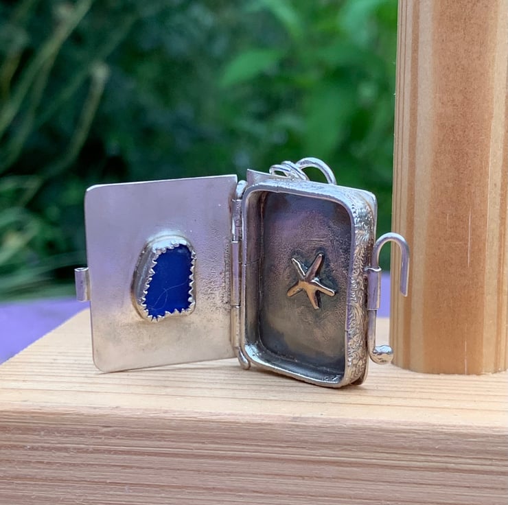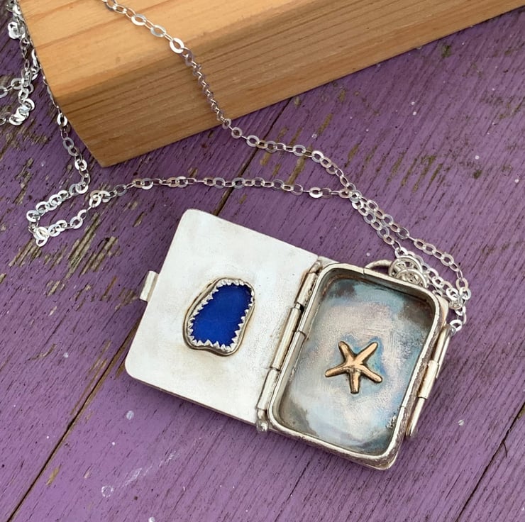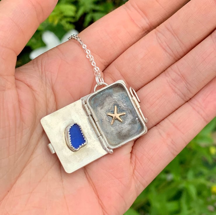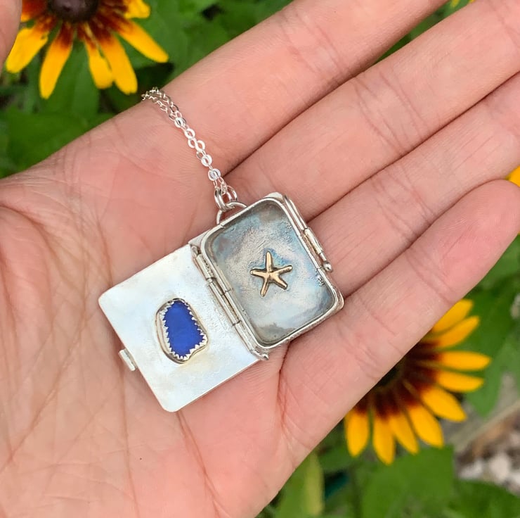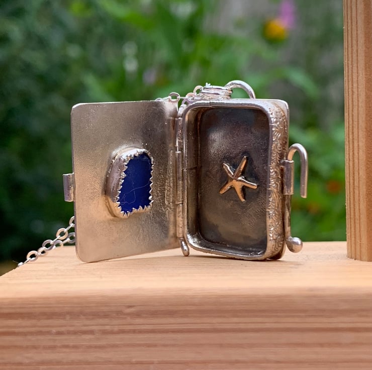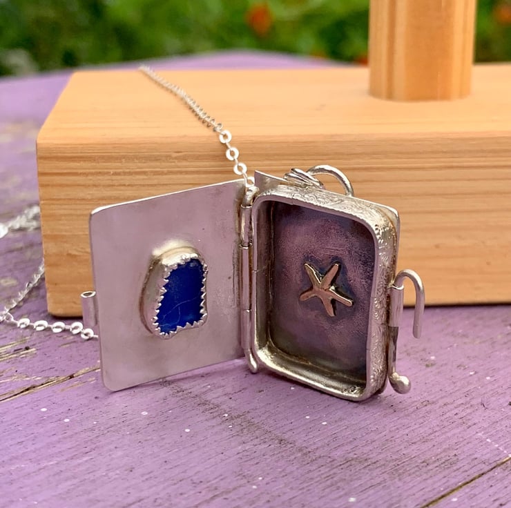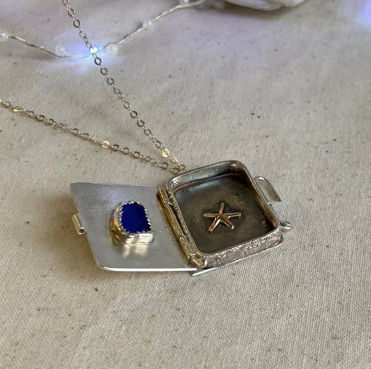 Unique and handcrafted locket with beautiful blue Seaglass. Opens and locks, all made in silver.
