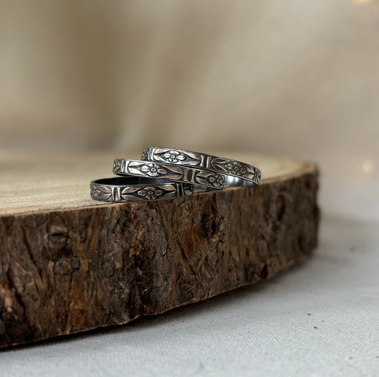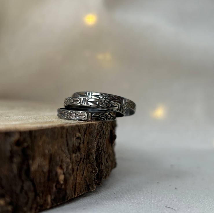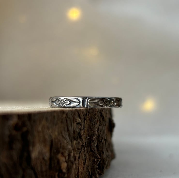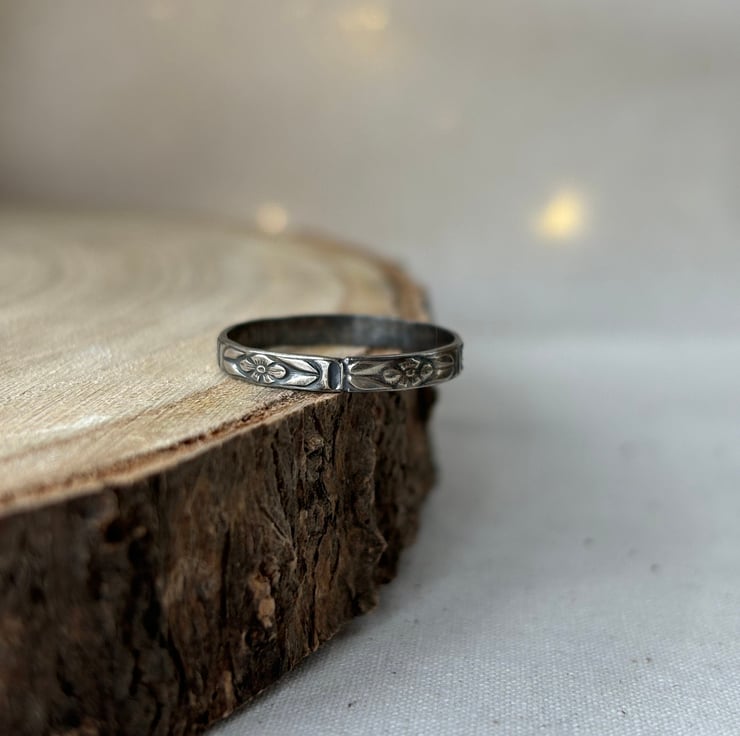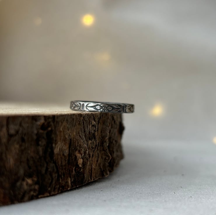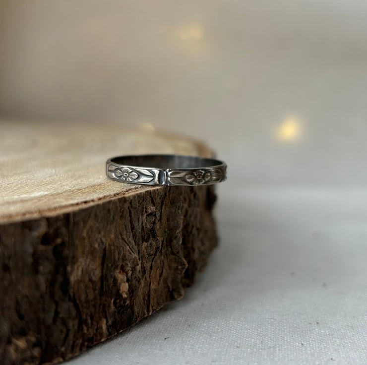 Lovely sterling silver ring with flora pattern, perfect stacking ring or wedding band. Select your size, place an order and wait for the piece.