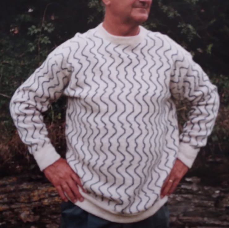 Bell ringer jumper with blue line designs, you can choose from an all over pattern or a partial panel. Doubles and minor methods work well but higher numbers of bells mean the blue lines are too long to fit and the greater width means that the lines are too spread out. Machine washable merino blend wool, any colour.