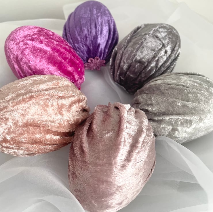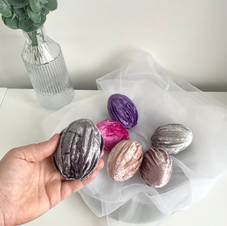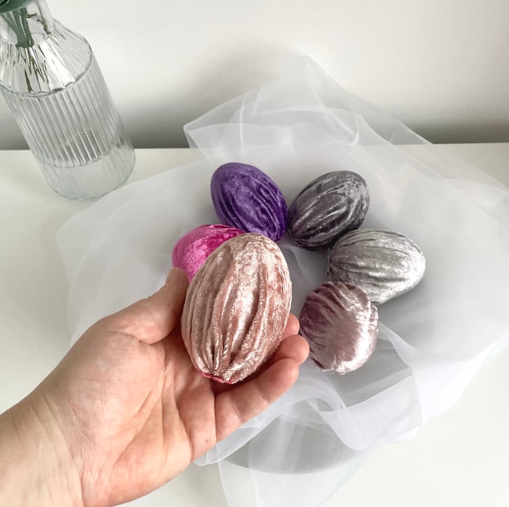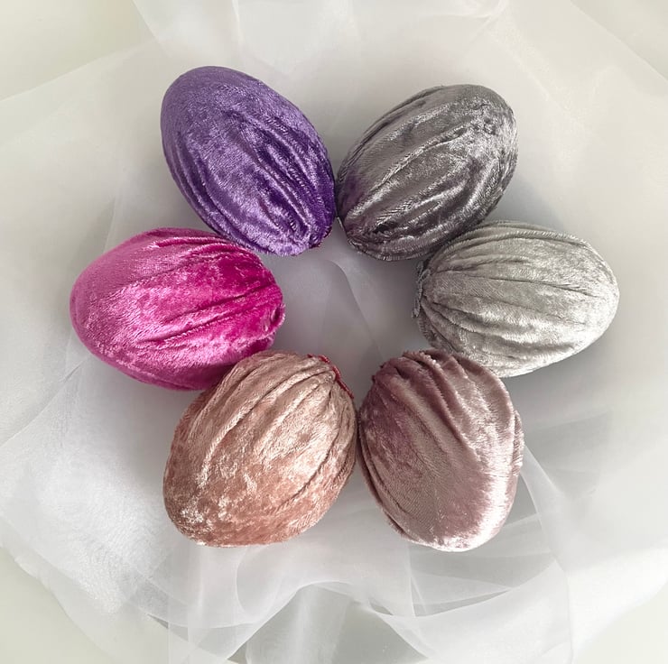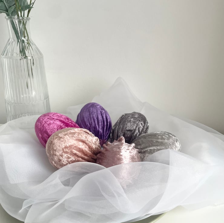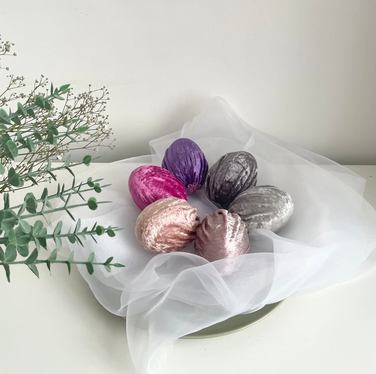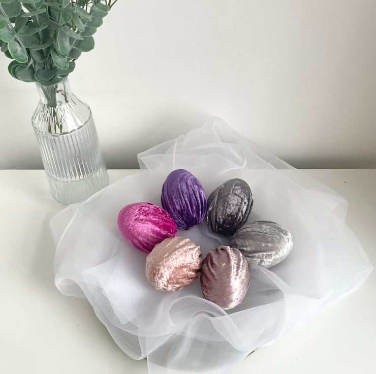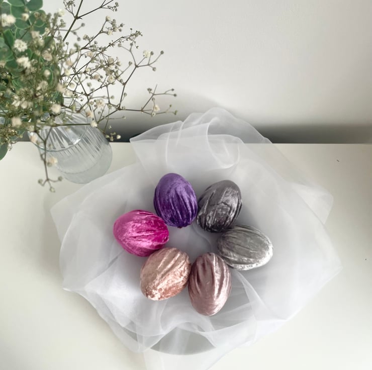 Add a touch of elegance and charm to your Easter celebrations with this set of 6 handmade velvet Easter eggs! Made from soft luxury velvet fabric wrapped around lightweight polystyrene eggs, these beautiful decorative eggs are perfect for creating a sophisticated and stylish spring display.