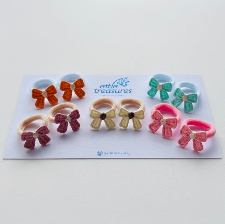 Handmade cute mini cotton sewn bows set on mini nylon bands for a soft comfortable hold. Perfect for babies first hair bobbles and any age.