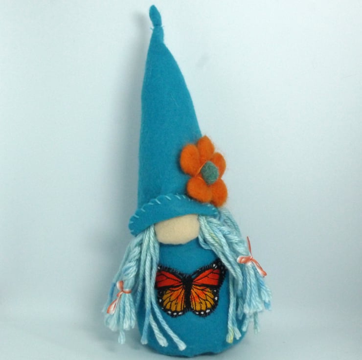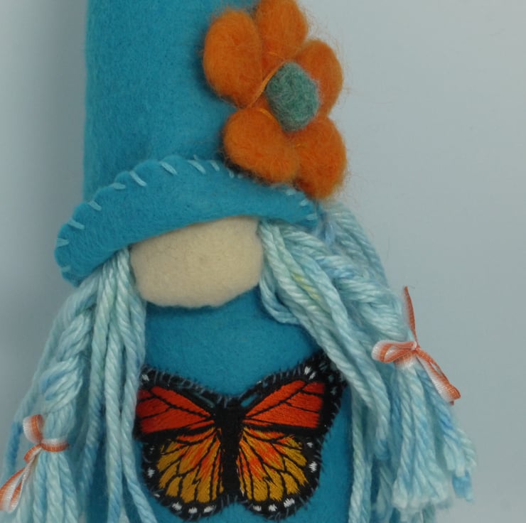 This is Indigo, the butterfly gnome. Another of our felt gnome characters. Indigo spends her days surrounded by butterflies and moths.