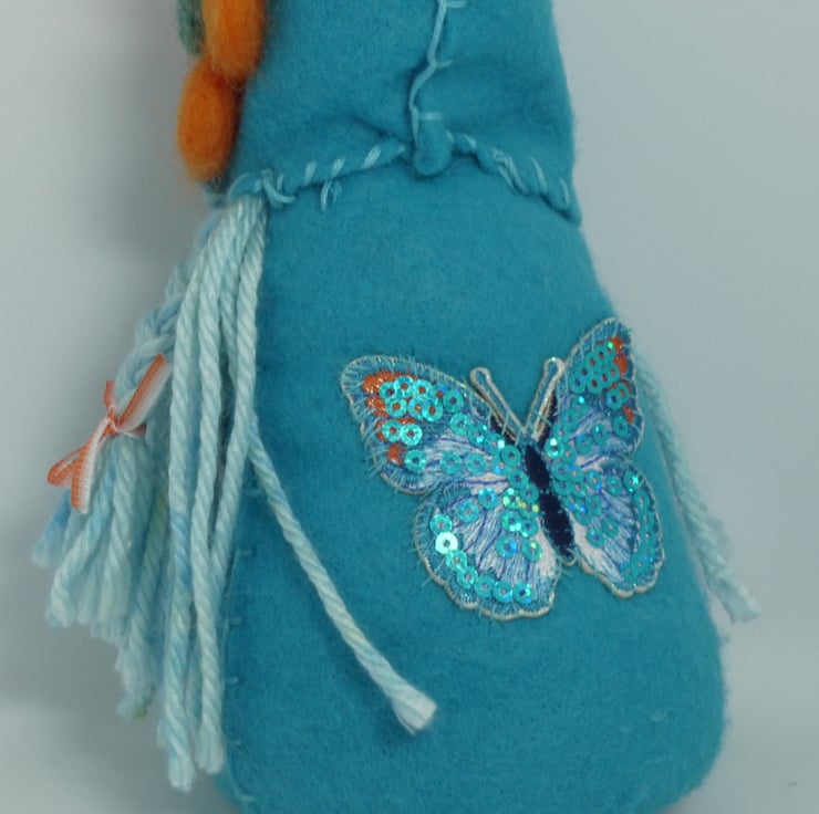 Made with coloured felt , hand sewn and decorated with a mixture of butterfly themed embellishments and a needle felted flower on her hat. Although she is stuffed with toy stuffing and is free standing, Indigo is not a toy and is for decoration purposes only.