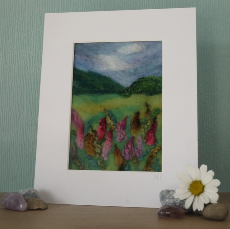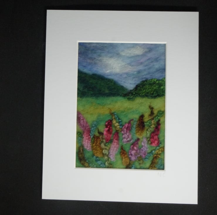 Handmade needle felted original artwork featuring a wildflower meadow scene. This artwork comes with a white mount measuring 8x10 inches, the aperture itself measures 7x5 inches, ready to be framed. The artwork includes mixed natural dyed wools, wool locks and silk fibres.handmade and signed by Natalie.
