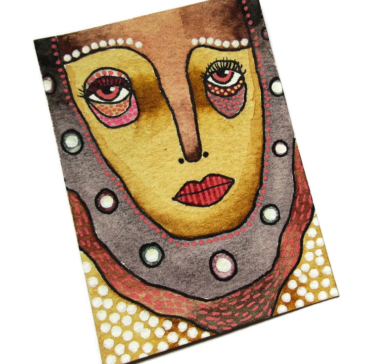 Original ACEO portrait miniature painting in watercolour and drawing pens on lightly textured, quality, watercolour paper. Measuring 2.5 x 3.5 inches, it would look super placed in wee frame, on a tiny easel as an accent, or with some other ACEOs in one larger frame. It will be discreetly signed on the front by Bea before shipping. ACEOs / ATCs are fun to collect, and an inexpensive way to start or grown your art collection. They also make perfect gifts for art loving friends or loved ones and can be used as a bookmark, or attached to the front of a blank greetings card.