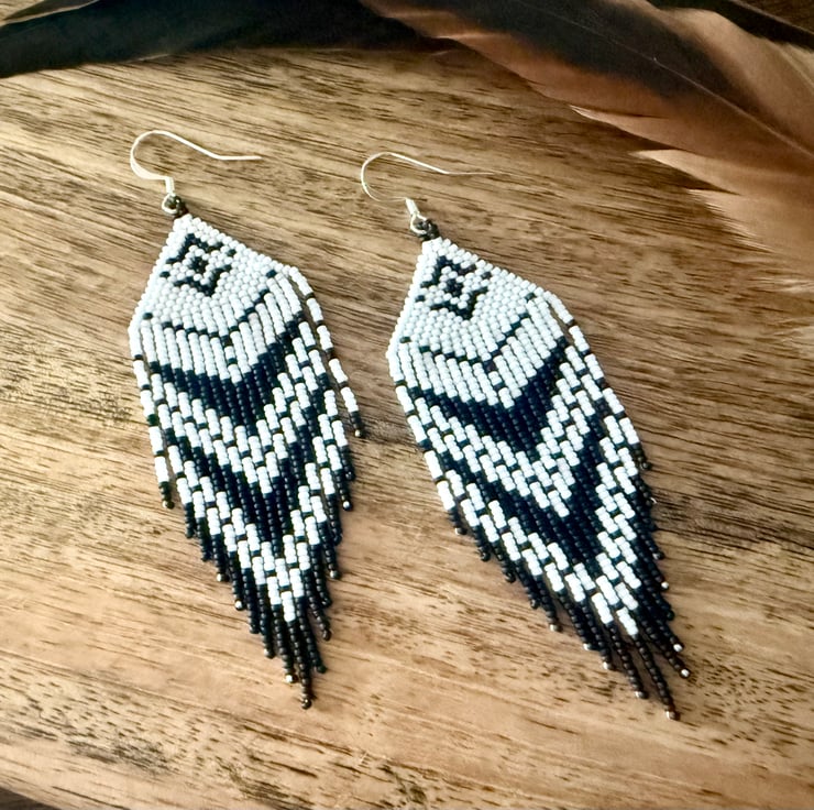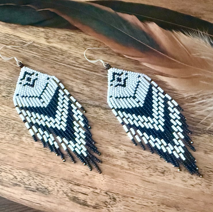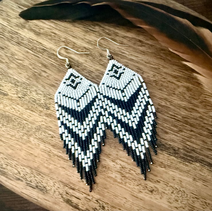 A beaded fringe hangs below the bead-woven section and follows the same Native American style pattern. The colours of the beads are opaque white and matt black and the fringe pattern is in white with blocks of black in a chevron design.