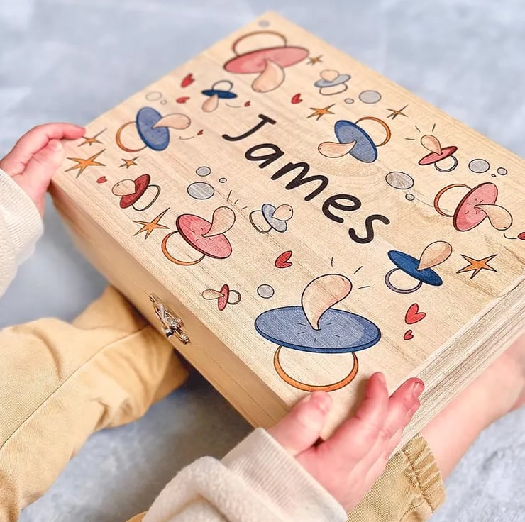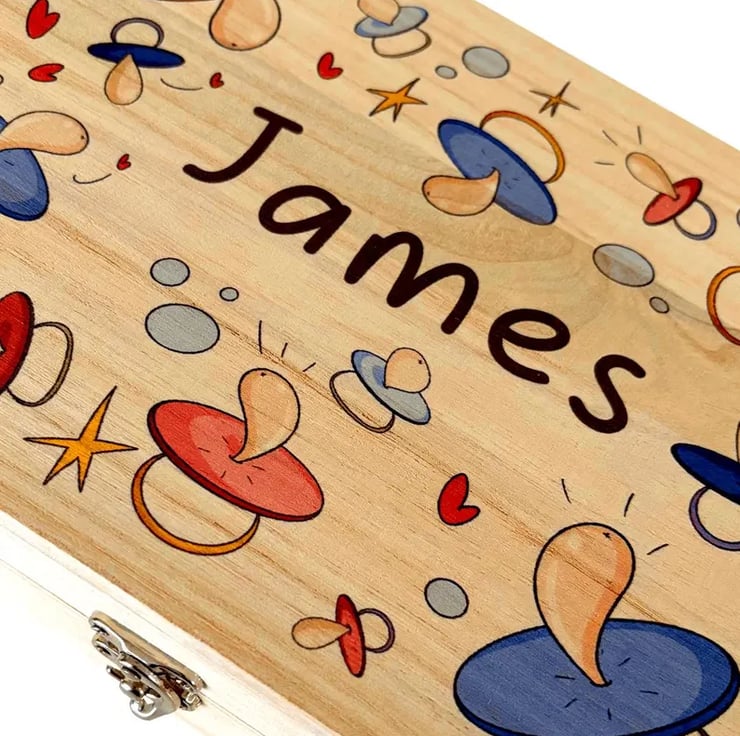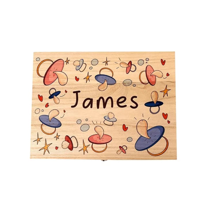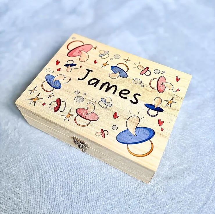 Turn giving up the dummy into a magical adventure with this charming Dummy Fairy Keepsake Box! Designed to mark your child’s special milestone, this personalised wooden box provides the perfect place for the Dummy Fairy to leave a treat or reward as thanks for their dummy.Made from premium pine wood, the box is personalised with your child’s name (up to 15 characters) and features a beautifully printed Dummy Fairy design. It’s a wonderful way to make dummy weaning a positive and exciting experience for little ones.Product Details:Personalised with your child’s name (up to 15 characters)High-quality pine wood with a Dummy Fairy designDimensions: 24.6 cm x 18.4 cm x 7 cmPerfect for treats, letters, and fairy surprisesWhy You’ll Love It:Encourages Positivity: Helps children embrace dummy weaning with excitement.Personalised Keepsake: A treasured memory to keep forever.Perfect Gift: A thoughtful and unique gift for little ones reaching this milestone.Make giving up the dummy magical with this Dummy Fairy Keepsake Box – order yours today and let the fairies do the rest!