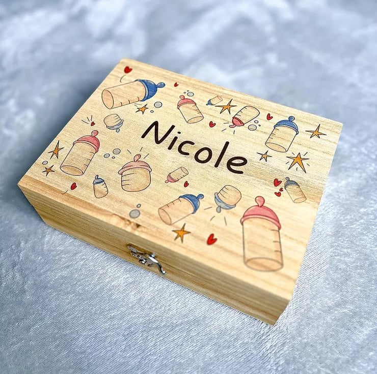 Bottle Fairy Keepsake Box! Designed to celebrate your child’s big milestone, this personalised wooden box is the perfect place for the Bottle Fairy to leave a special treat or note as a reward.Crafted from high-quality pine, the box can be customised with your child’s name (up to 15 characters) and features a beautifully printed Bottle Fairy design. Whether it’s for keepsakes, treats, or a magical fairy exchange, this box helps make bottle weaning a positive and memorable experience.Product Details:Personalised with your child’s name (up to 15 characters)High-quality pine wood with a Bottle Fairy designDimensions: 24.6 cm x 18.4 cm x 7 cmPerfect for treats, letters, and fairy surprisesWhy You’ll Love It:Celebrates Milestones: A magical way to encourage bottle weaning.Custom Keepsake: A personalised treasure for your child to cherish.Perfect Gift: Ideal for parents looking for a unique and thoughtful solution.Create magical memories with this Bottle Fairy Keepsake Box – order yours today and make bedtime milestones a breeze!
