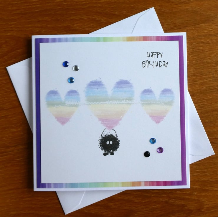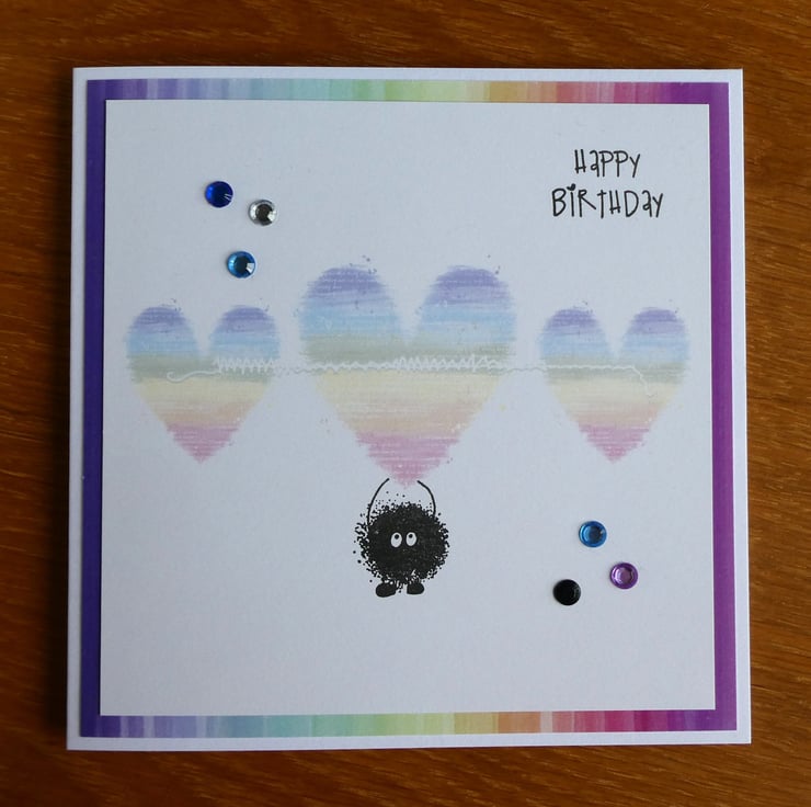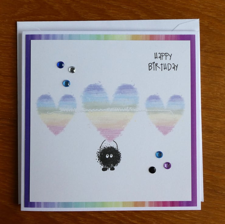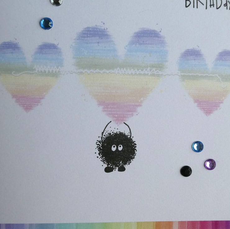 This birthday card has a printed background paper with a row of 3 pastel rainbow coloured hearts.