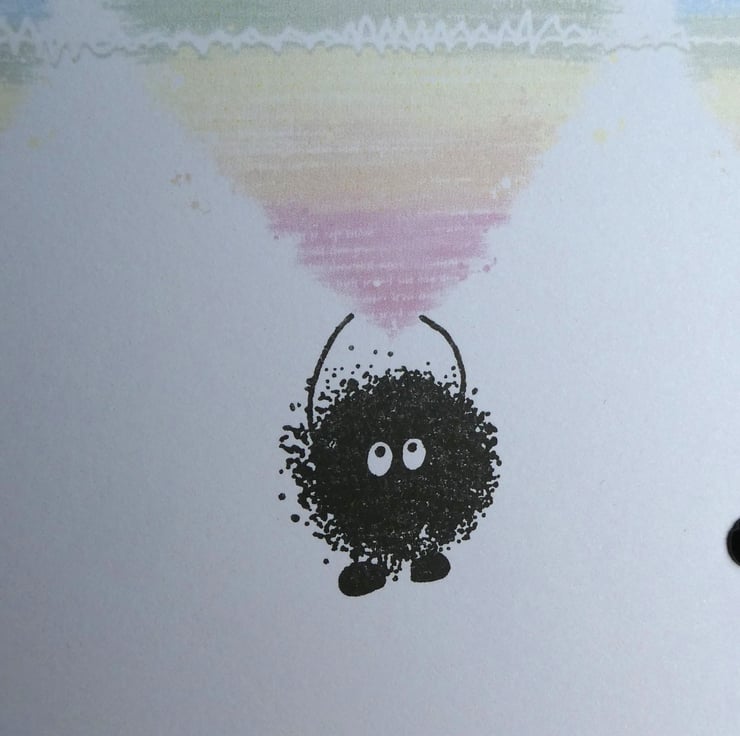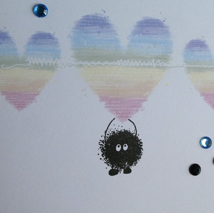 A cute 'love bug' has been hand stamped in black archival ink, positioned to look like it is holding the central heart above it's head in both hands.