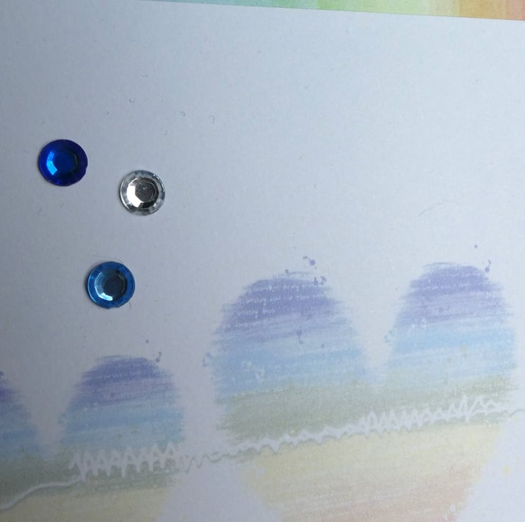 The message Happy Birthday has been stamped in the top right corner and faux gems in shades of blue, lilac, black and clear have been added.