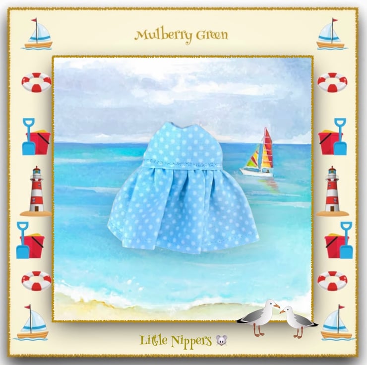 A sweet little pale blue spot dress, made especially to fit the Little Nippers. The dress fastens at the back with a little popper.