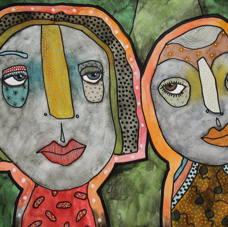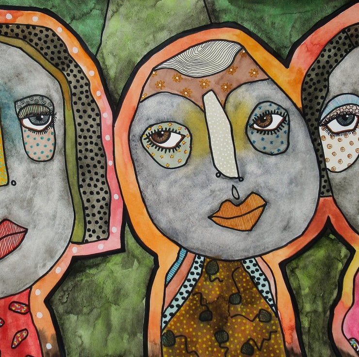 Striking hand painted & illustrated figure / portrait painting in watercolour and drawing pens on heavy watercolour paper. Measuring 19.75 x 10 inches this original artwork would make an interesting and attractive focal point in any interior. It will be hand signed on the front by Bea before dispatch and it is unframed - Framed photos are for illustration purposes only.