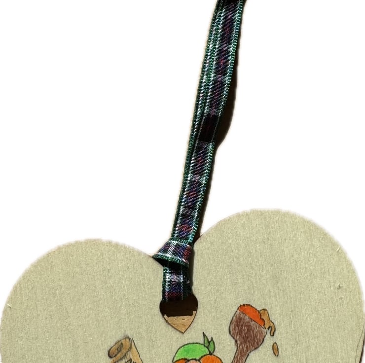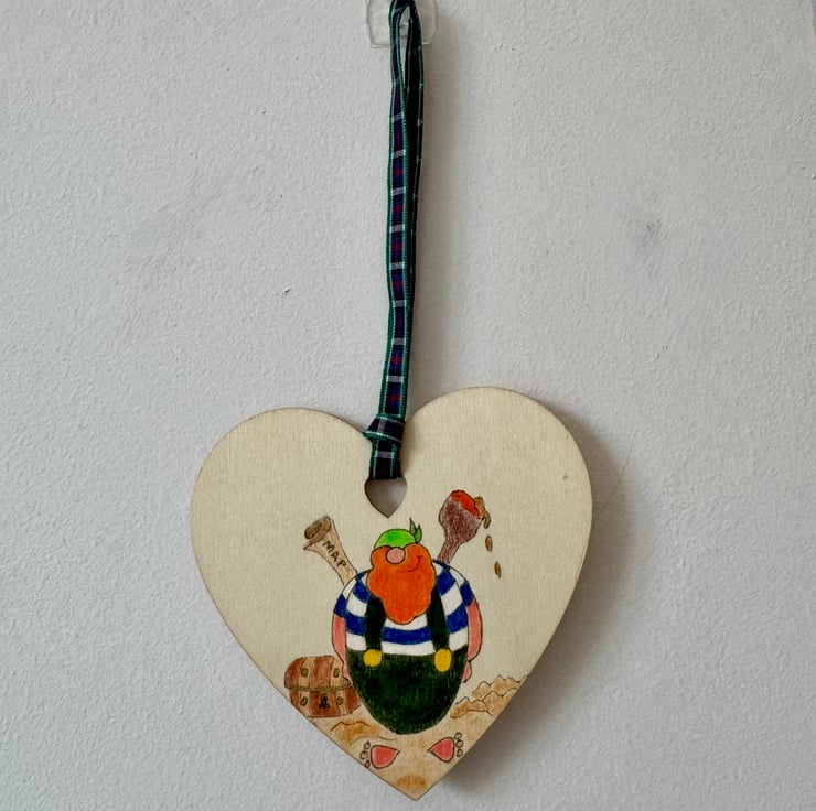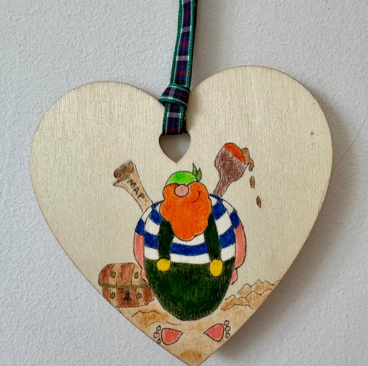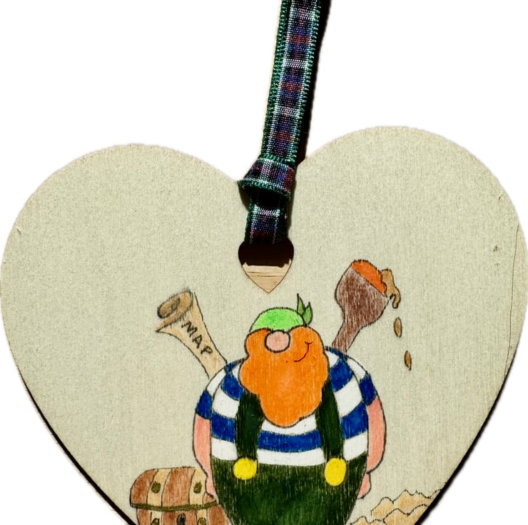 This hand drawn picture of a Treasure Hunting Pirates measures 10x10cm and is coloured using watercolour pencils. The tartan hanging ribbon adds another 10cm drop.