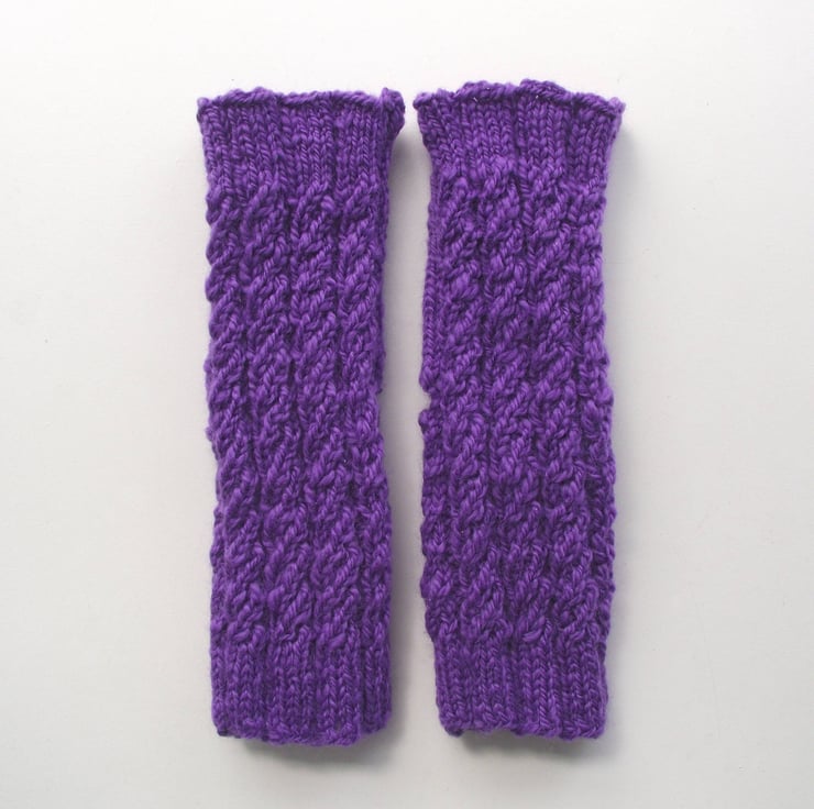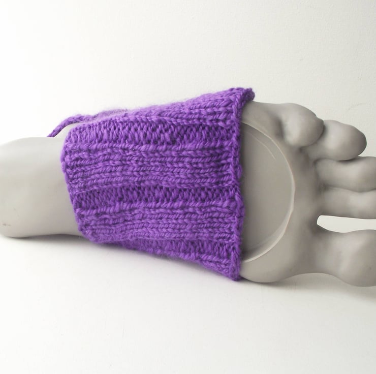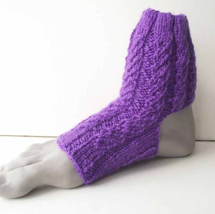 These unique socks, which are knitted from soft handspun purple merino wool, are made for wearing while doing Yoga, Pilates, gymnastics, dancing or any other indoor exercise. They can also be worn while having a pedicure. They have no heels or toes so that you can still grip, but they keep the rest of your feet warm. They can also be worn with flip-flops or toe-post sandals. These would fit a small to medium woman. If you want a larger size, contact me to discuss a custom order.
