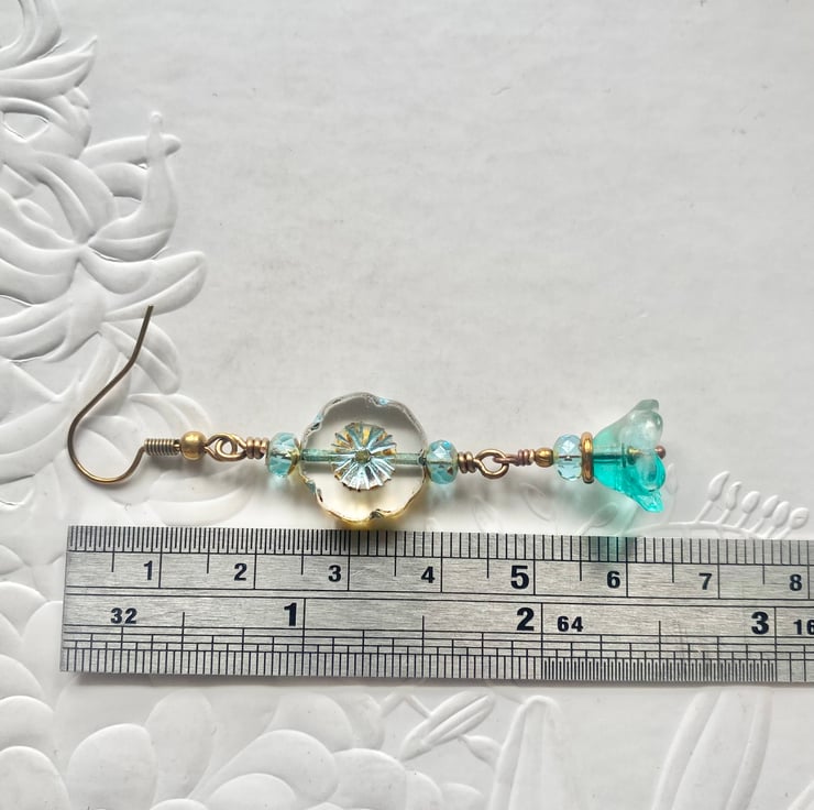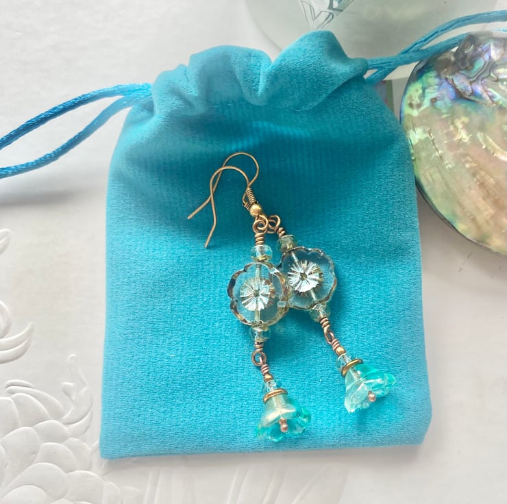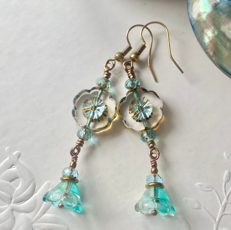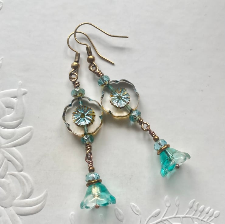 I made these beautiful long drop earrings using 14mm Czech glass flower beads and faceted rondelles. I have added lovely blue-green Lucite flower dangles to the bottom and linked everything together with hand wrapped antique bronze links. I have finished the earrings with antique bronze shepherd hooks. Beautiful earrings with lots of movement.