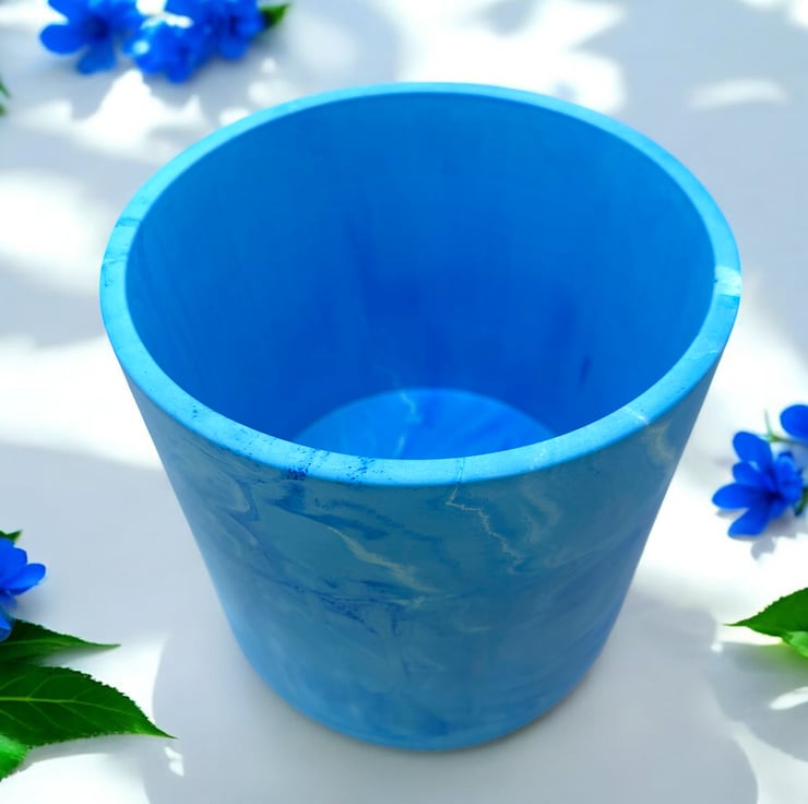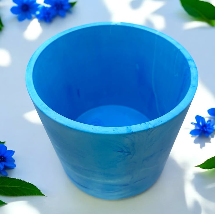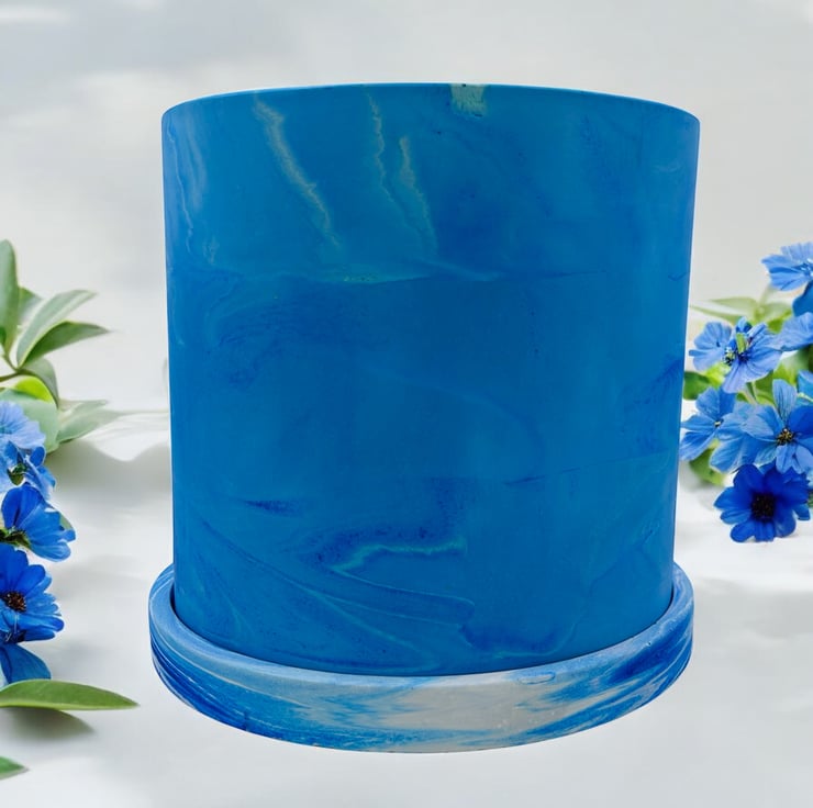 This extra-large handmade plant pot features a subtle marble effect in various shades of blue against a blue summer sky coloured background. Thoughtfully crafted from Cassini, a material commonly used for restoring and repairing marble and stone, this flower pot has a smooth and tactile finish reminiscent of marble. Additionally, it is water and weather-resistant, making it suitable for both indoor and outdoor use.