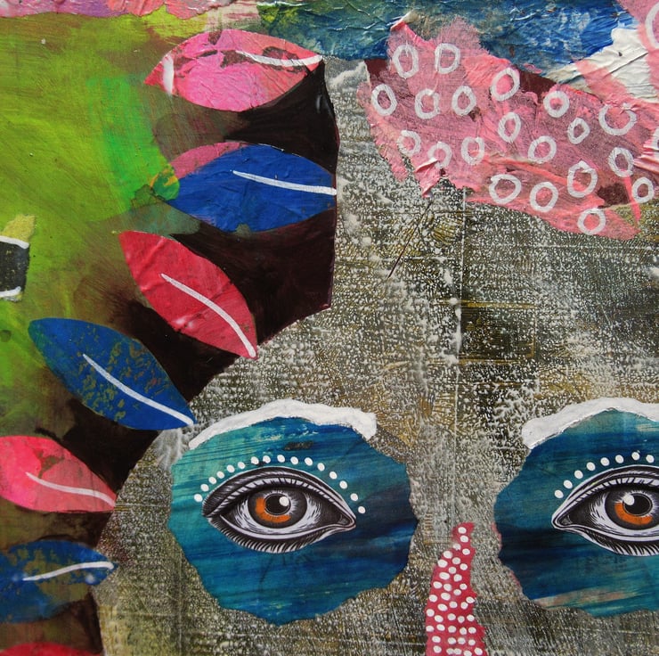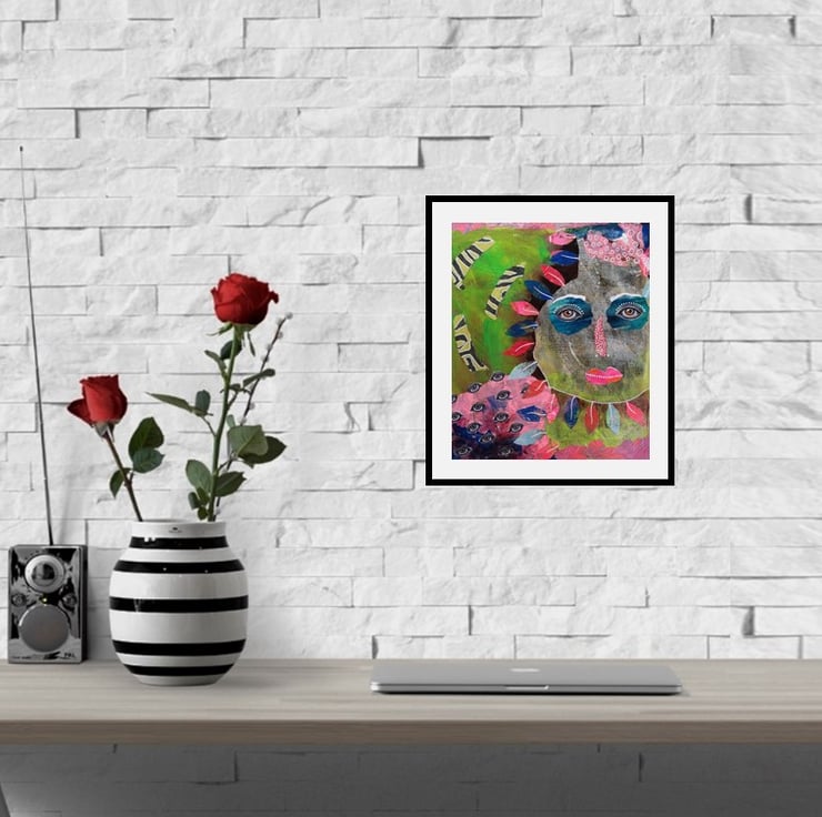 Colourful abstract portrait / face painting in a mix of acrylic, collage and drawing pens on 2mm board. Using my own painted and printed on vintage papers, it measures 10 x 12 inches - the perfect dimensions to place straight into any standard 10 x 12 inch sized frame or mount. It will be hand signed on the front by Bea before shipping and it comes to you unframed and has a soft sheen surface finish. (Framed photos are for illustrative purposes only.)