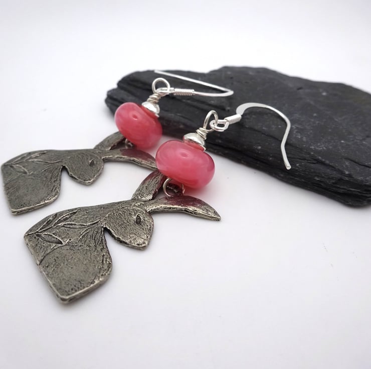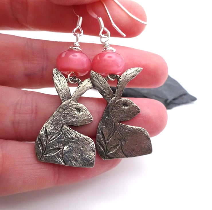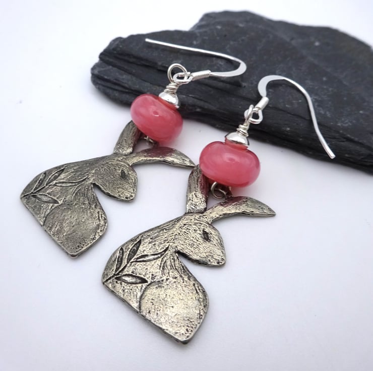 A pair of earrings made with sterling silver ear wires, handmade lampwork pink glass beads and handmade pewter hare charms.