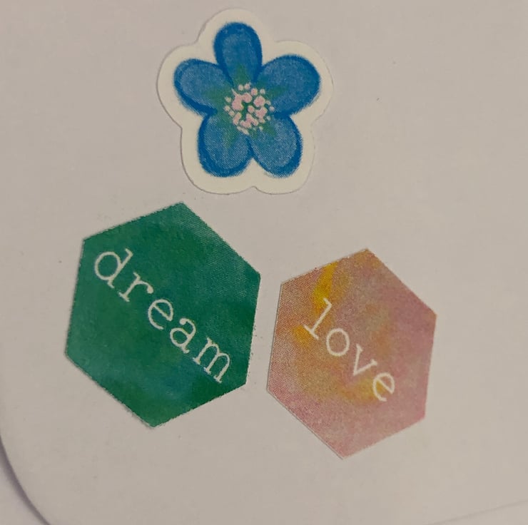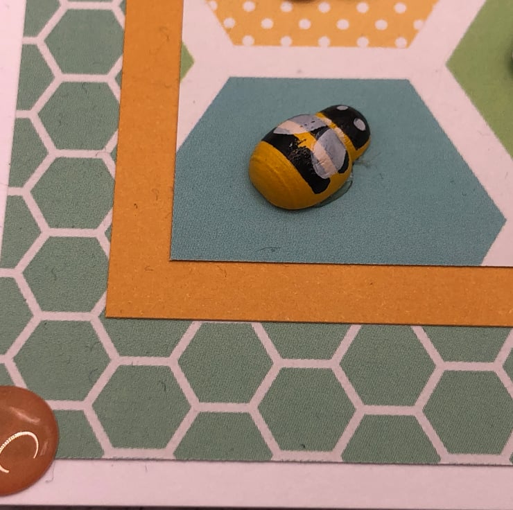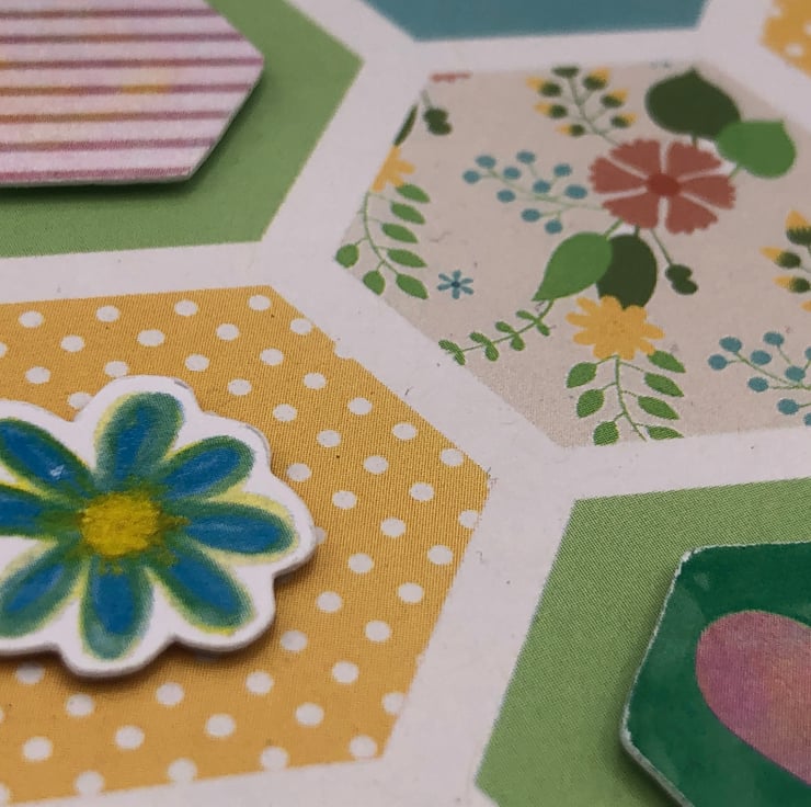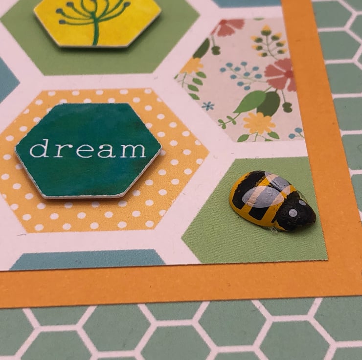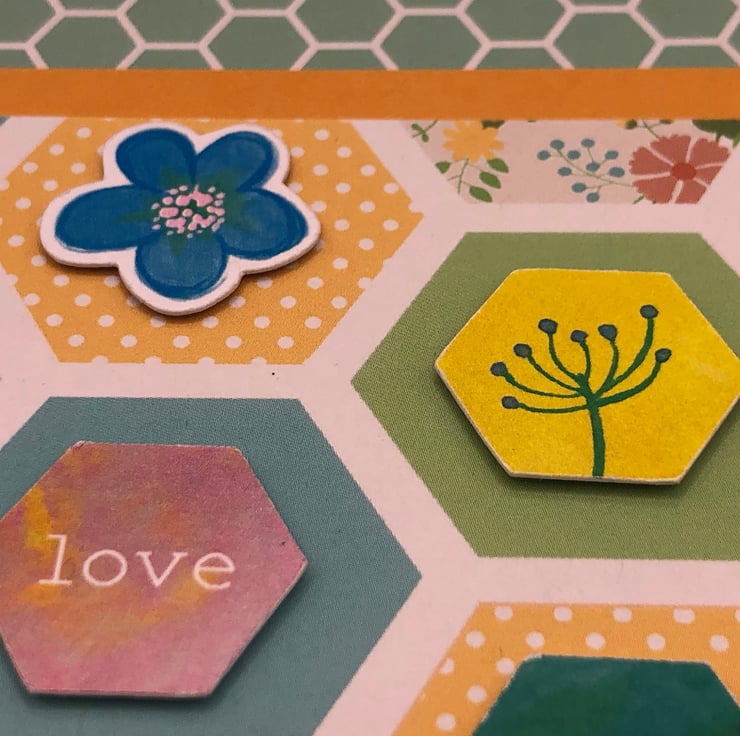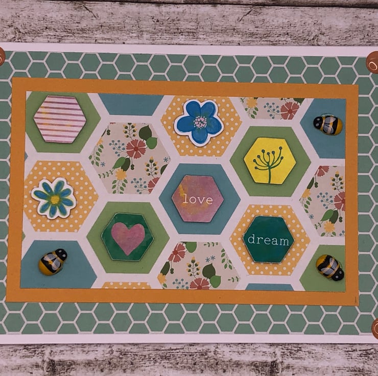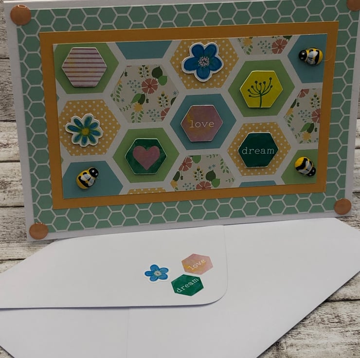 A bright modern card with hexagonal design, the main card and envelope are white. A pale green hexagonal patterned card is mounted on top to create the background for pastel coloured beehive design, each hexagon has a different element from floral, polka dots, and little wooden bees. The word "love" and "dream" are mounted on foam pads in two of the spaces. Peach beads in the corners complete this fun card. The inside is blank for own message and the back of the envelope has matching design stickers. A card for many occasions from Birthday, leaving, new job, congratulations, well done, to new adventures.