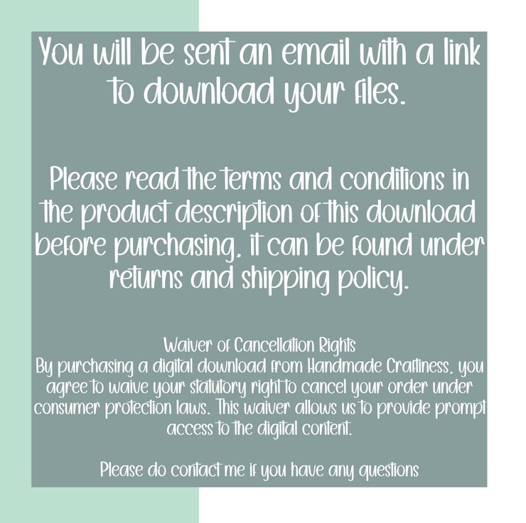 No Refunds for Digital Downloads Refund Policy for Digital Downloads Acceptance of Terms By completing your purchase, you acknowledge and accept this refund policy. At Handmade Craftiness, we are committed to providing high-quality digital products. Please read our refund policy carefully before making a purchase: Waiver of Cancellation Rights By purchasing a digital download from Handmade Craftiness, you agree to waive your statutory right to cancel your order under consumer protection laws. This waiver allows us to provide prompt access to the digital content. No Refunds After Download For digital downloads, consumers are required to waive their cancellation rights before the digital content can be provided. This means that once a customer (i.e., the consumer) has downloaded the content, they have given up their consumer rights to a refund. This policy aligns with consumer law for digital goods, ensuring the protection of intellectual property and preventing unauthorized distribution. Cancelling a Digital Download Under the Consumer Contracts Regulations 2013, digital downloads are neither goods nor services, meaning the law is a little different. If you want to download something within 14 days of buying it (known as the 'cooling-off’ period), you must give your consent to waive the 14-day cooling-off period. If you do not give your consent, the 14-day cooling-off period still applies. However, you will not be able to download your digital content until this period has ended. This policy exists to prevent customers from changing their minds after downloading the content. As you are being sent a link via email to download after purchase this will count as downloading the content as you will have access to download the files from the email. Eligibility for Refunds Refunds may only be issued under exceptional circumstances, such as: The digital content is proven to be defective or incomplete. An error on our part (e.g., duplicate billing). Contact Us If you believe you are eligible for a refund due to one of the exceptional circumstances above, please contact us at orders@handmadecraftiness.co.uk with your order details, a description of the issue, and proof of purchase. Our team will review your request and respond within 7 business days. For further inquiries, please contact us at orders@handmadecraftiness.co.uk. ------------------------------------------------------------------------------------------------------------------------------------------------------------- Ownership and Usage: All artwork within this shop is the exclusive property of Handmadecraftiness. You are expressly prohibited from reproducing, altering, redistributing, reselling, or claiming ownership of any digital item from this store. However, you are permitted to incorporate products from this store into your own physical handmade items for sale as a hobbyist. TERMS OF USE 1. You may print and use these items in a tangible journal/scrapbook/craft project etc. 2. You MAY NOT sell or share these files. 3. You MAY NOT reproduce/alter/redistribute our designs as a digital or physical item. 4. You MAY NOT sell or manipulate these files for resale purposes. 5. You MAY NOT share these files individually or as kits.