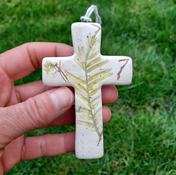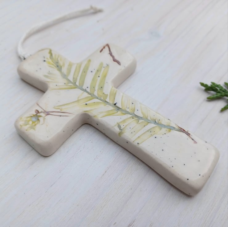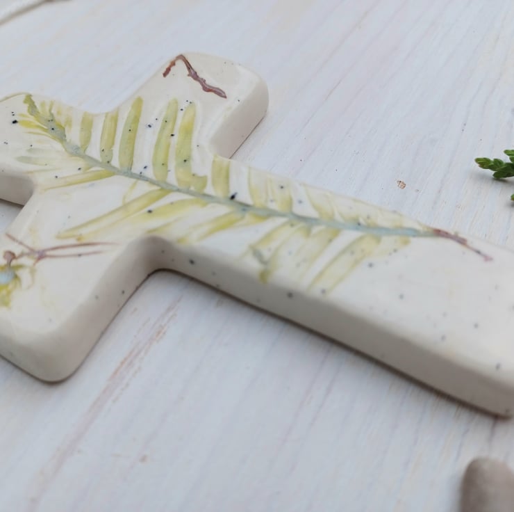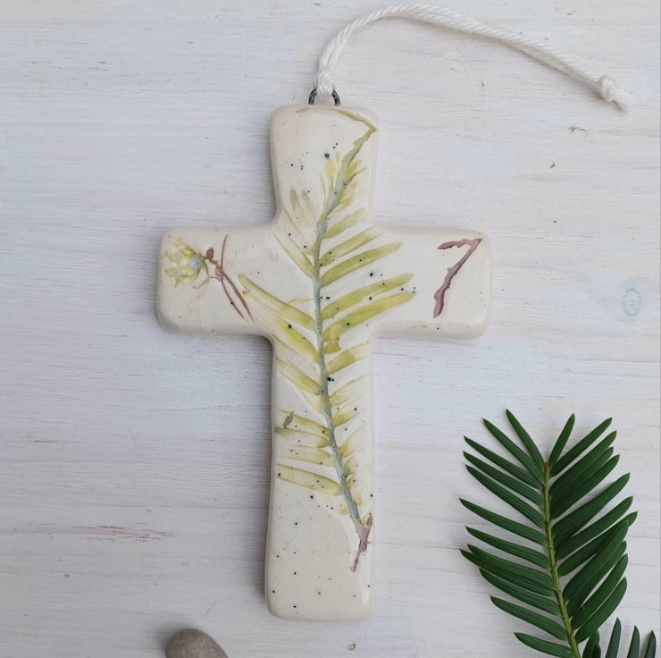 A beautiful handmade Ceramic Cross decoration. Real leaves have been carefully pressed into earthenware clay, leaving a beautiful textured botanical impression. The clay has then been cut and shaped by hand into a cross.