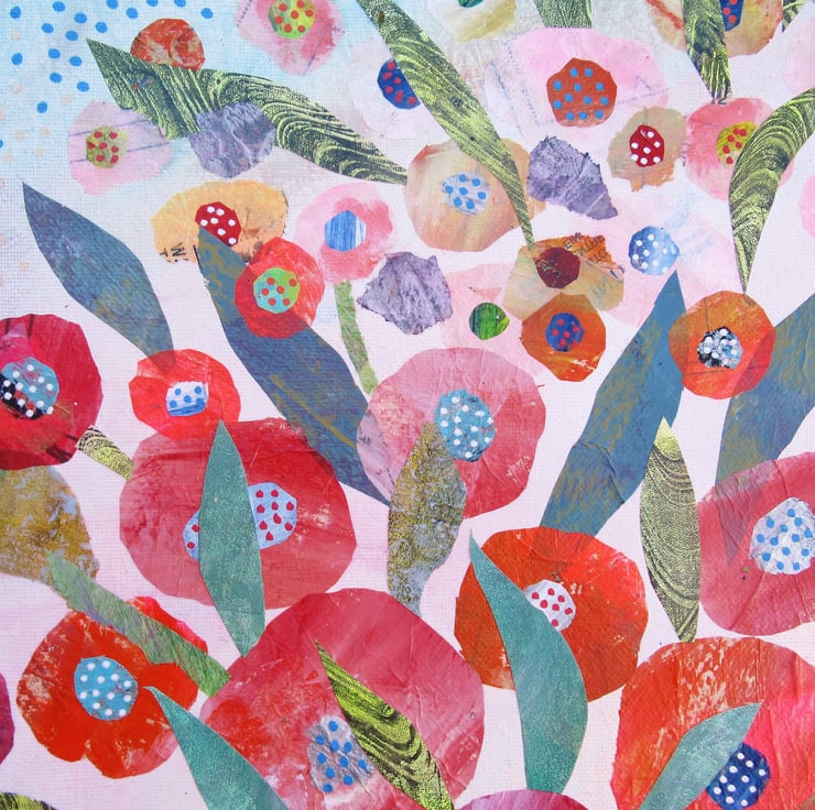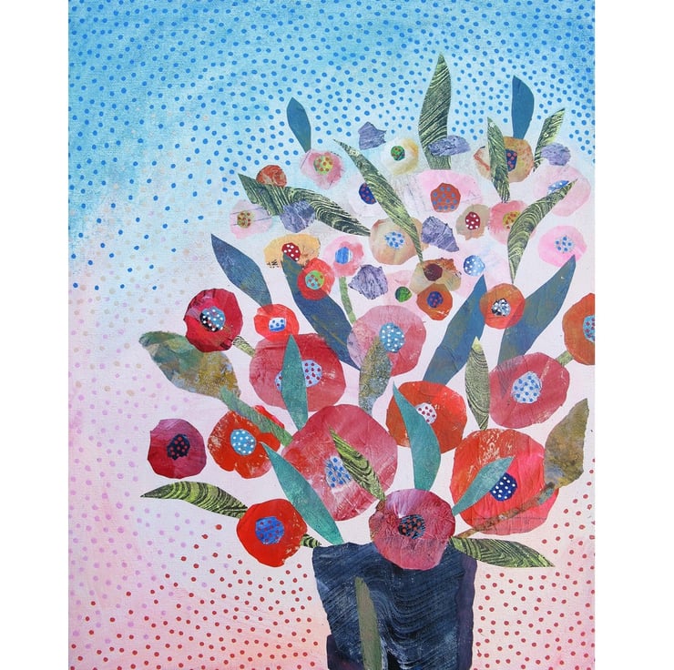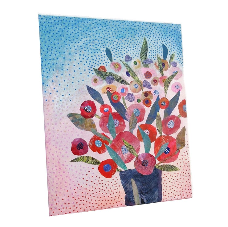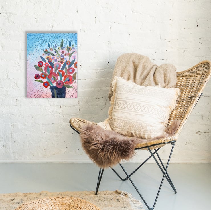 Attractive mixed media painting in acrylic and collage on 14 x 18 inch stretched canvas with white painted edges. In an array of attractive colours and depicting a vase of pretty pink and red blooms. Signed up the edge by Beatrice, and it has a soft sheen surface finish.