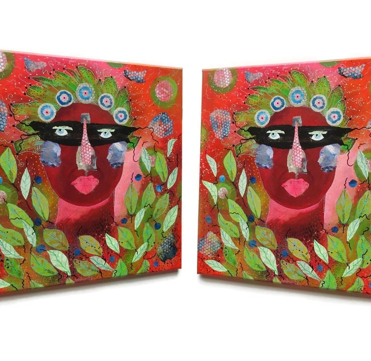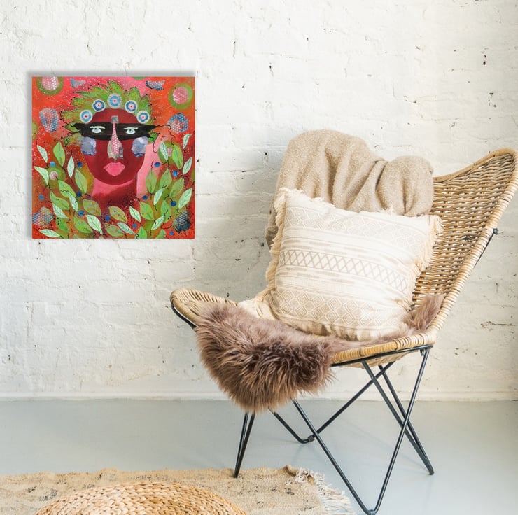 Stunning, large format painting in acrylic, collage and drawing pens on 20 x 20 inch staple free sided canvas. Jewel coloured, with light surface texture in parts, and lots of drawn detail. This artwork is so striking and would make a 'WOW' factor focal point in any interior. The edges of the canvas are painted so no frame is required - simply unpack and hang on the wall. It is signed on the edge by Beatrice and has a soft sheen surface finish.
