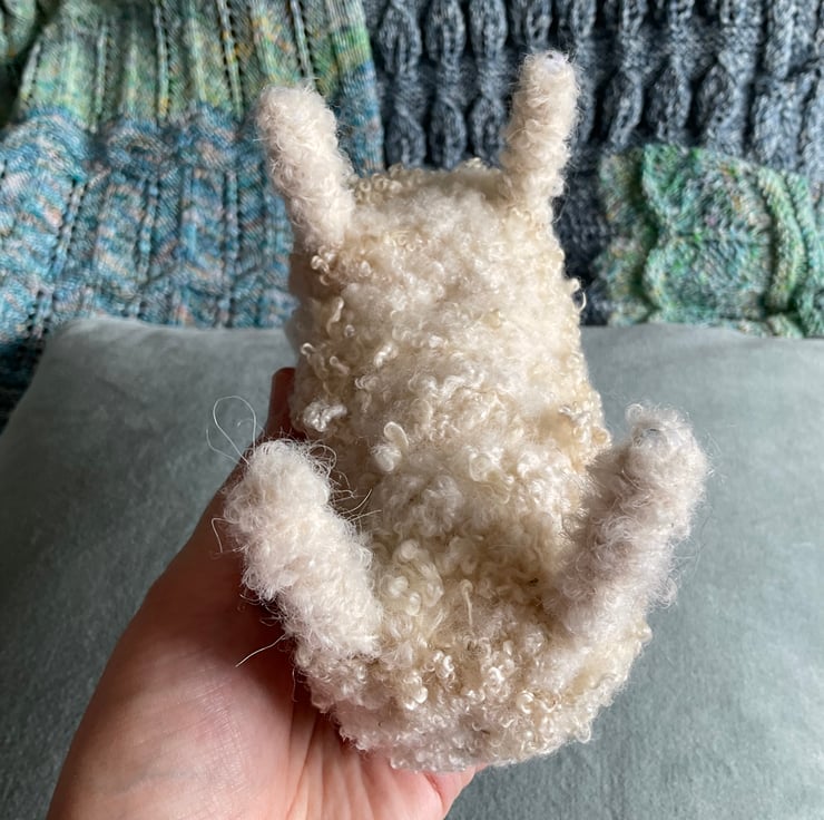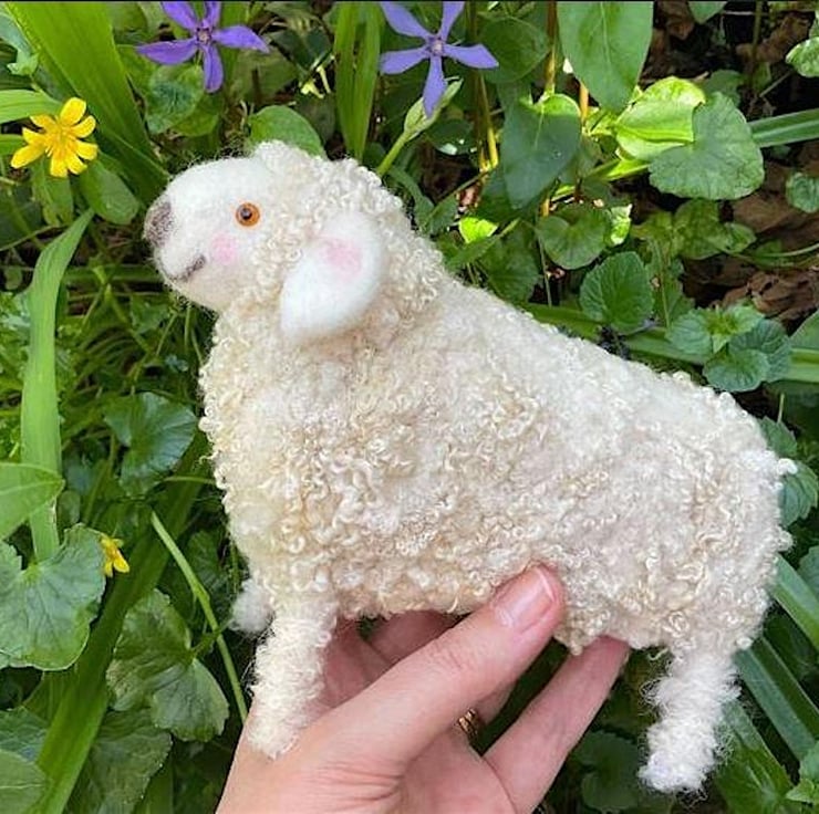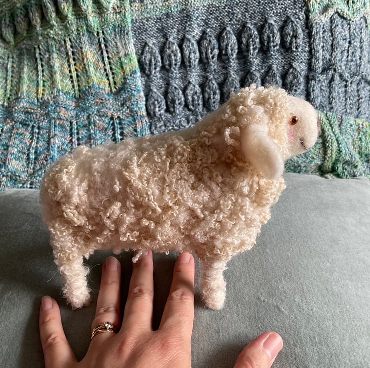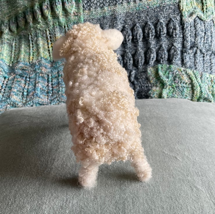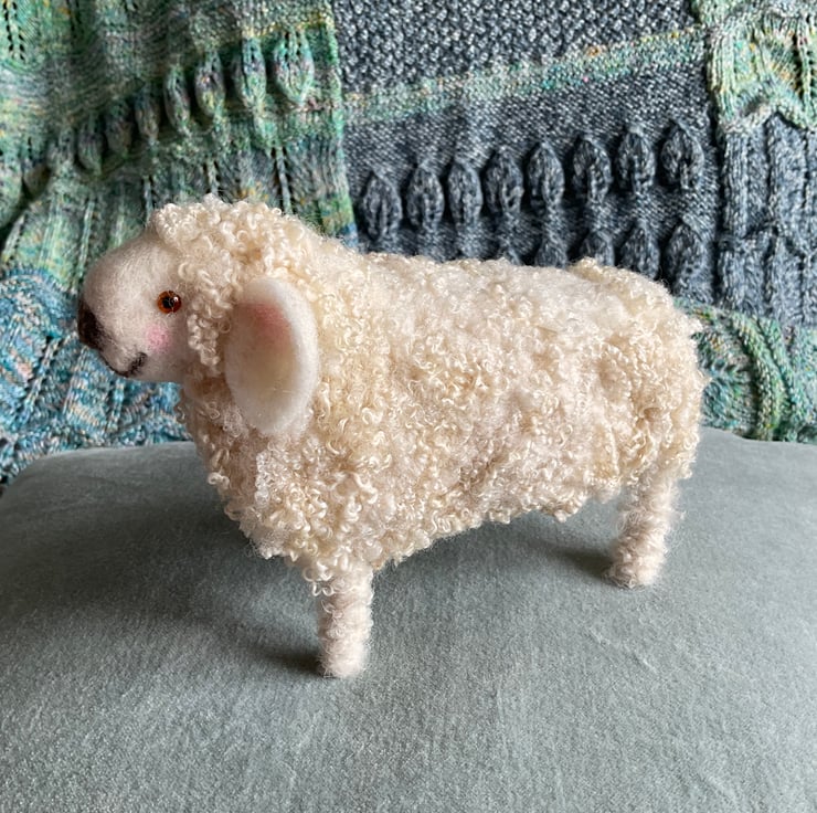 Made by needle felting ethically sourced wool, with wire legs and glass eyes. The curls are British Bluefaced Leicester wool.
