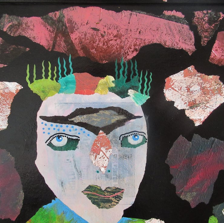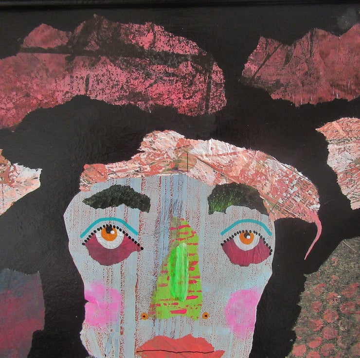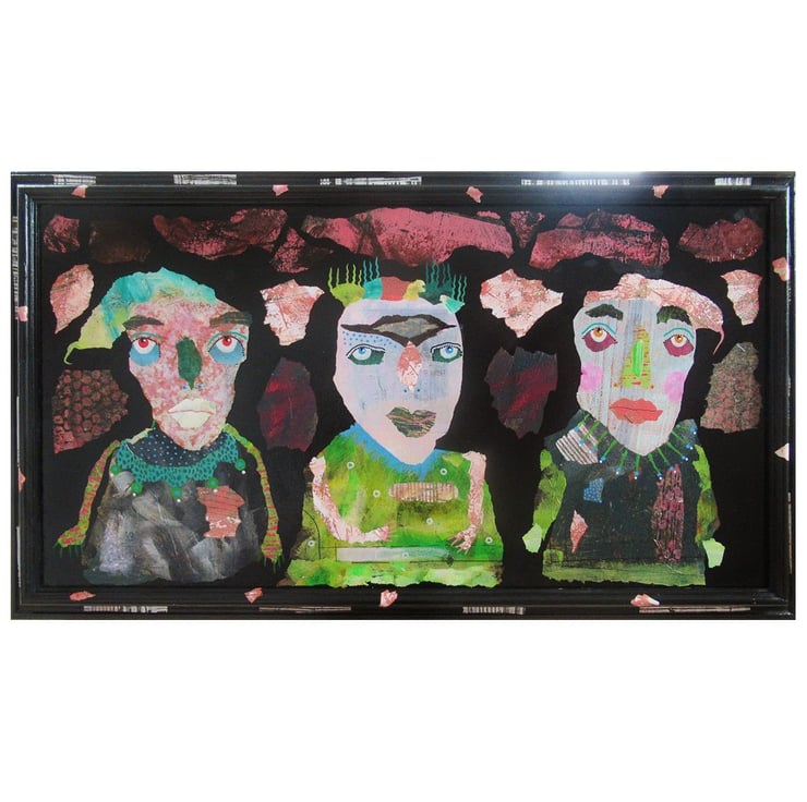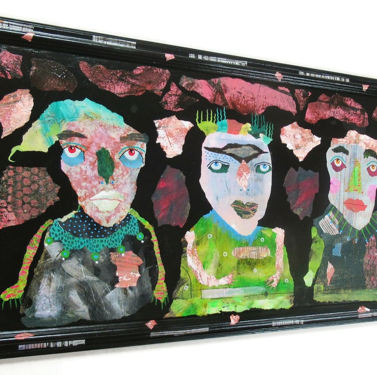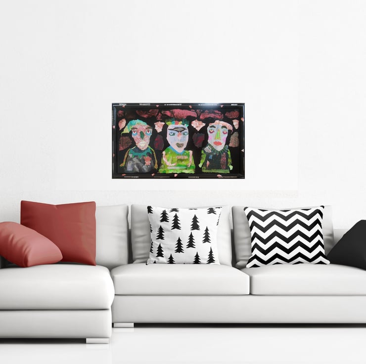 Extra large, striking, primitive, outsider style statement painting in acrylic, collage and drawing pens on board in a wooden frame which I painted and collaged to match the art. measuring 32.5 x 18.5 inches including the frame, it is discreetly signed on the front by Bea and it has a soft sheen surface finish. This artwork is perfect for anyone wanting something that bit different! PLEASE NOTE- the frame is unglazed (does not have glass in.)