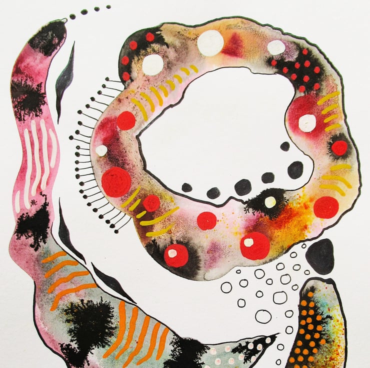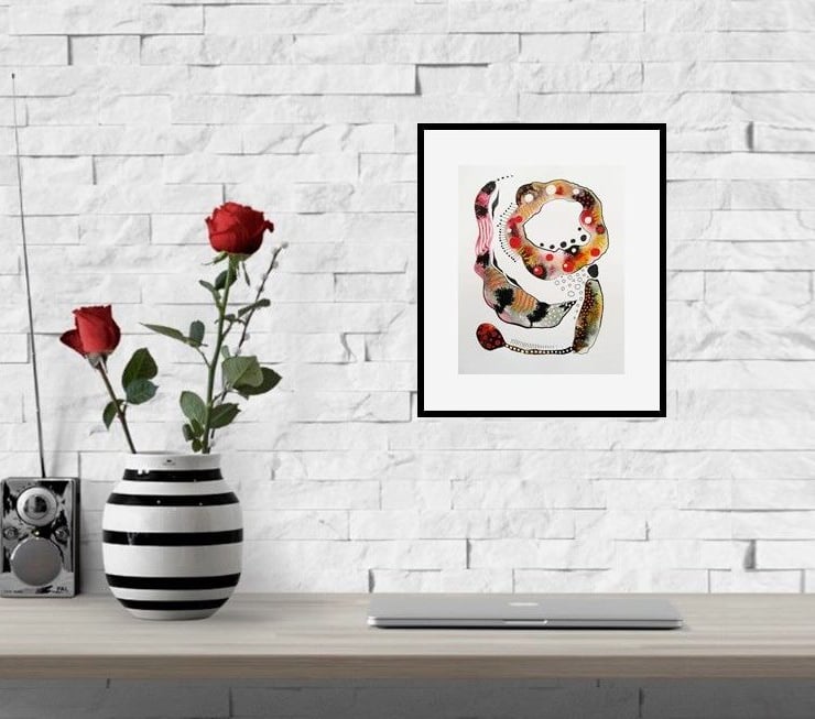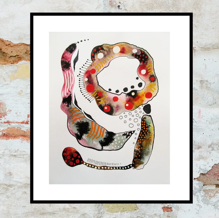 Beautiful, original 8 x 10 inch abstract painting in watercolour ink & drawing pens on heavy creamy white mixed media paper. This unframed artwork will conveniently slip into any standard 8 x 10 inch frame (or mount.) With interesting ink drifts and rivulets, hand drawn detail and attractive colour nuances, the artwork will be signed on the front before shipping. Framed photos are for illustrative purposes only.