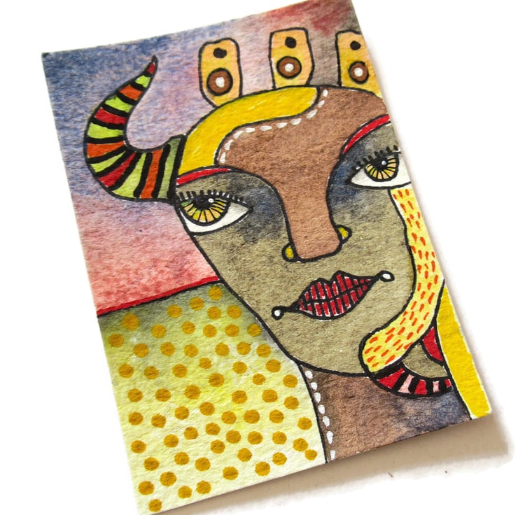 Quirky and colourful, miniature portrait painting in watercolour and drawing pens on quality heavy watercolour paper. Measuring the usual ACEO size, of 2.5 x 3.5 inches, it would look awesome in a wee frame, or on a tiny easel. Alternatively, display with a bunch of other ACEOs in one larger frame for on the wall. It will be hand signed on the front by Bea before shipping. ACEOs / ATCs are great fun to collect, and an affordable way to start or grown your art collection. They also make perfect original art gifts, can be used as a bookmark, or attached to the front of a blank greetings card.